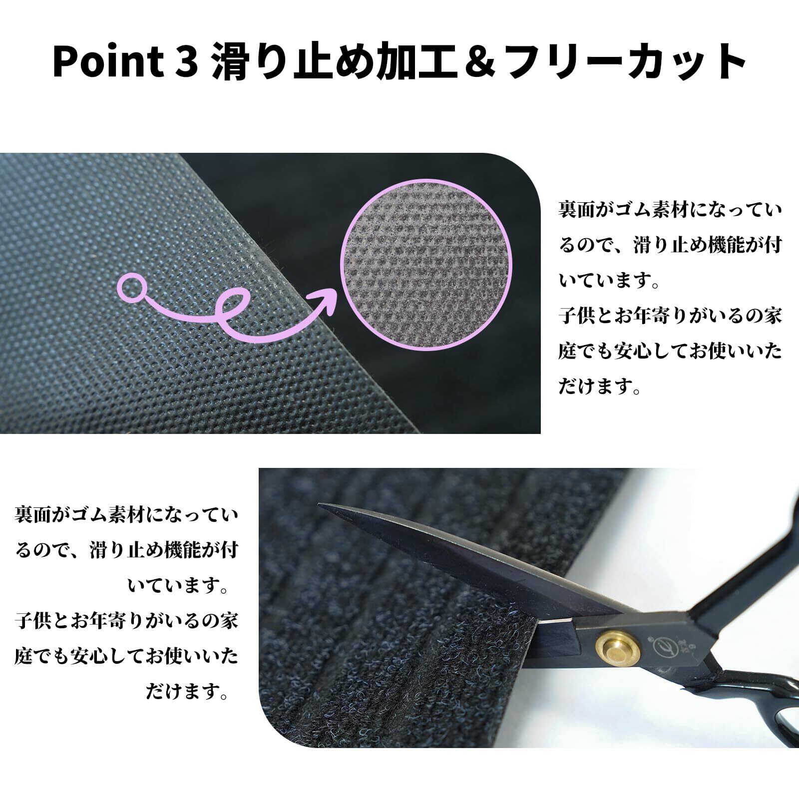【商品規格】サイズ:40×60cm ;50×80cm;60×90cm;80×120cm;90×180cm;100×120cm;100×150cm;120×150cm。表面素材:ポリプロピレン繊維(耐摩耗性&耐摩擦性に優れ、長時間踏んでも崩れません);裏面素材:天然ゴム(滑り止め機能付き)。ハサミやカッターでお好みのサイズ・形にカットできるから色んな場所にピッタリ!