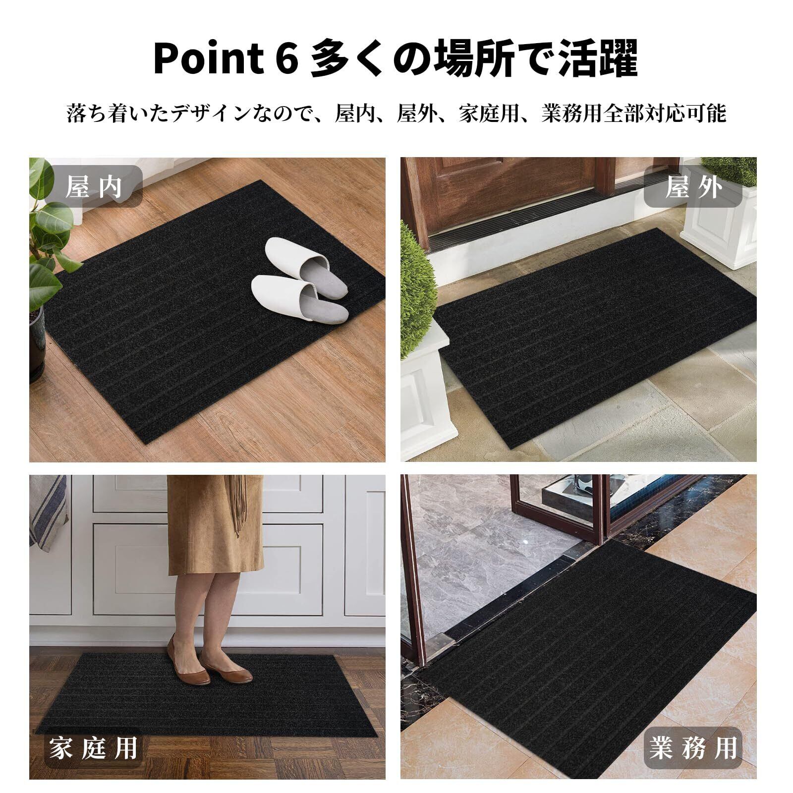 【使う場所を選ばない玄関マット】屋内、屋外でお使いいただける玄関マットです。ドアマット、階段マット、玄関マット、キッチンマットなど、様々な使い道でご利用いただけます。一般住宅、オフィス、会社、ビル、学校、飲食店、美容院、店舗など幅広くご使用いただけます。玄関マット自体に重さがあるので、屋外で強風が吹いてもずれにくいんです。