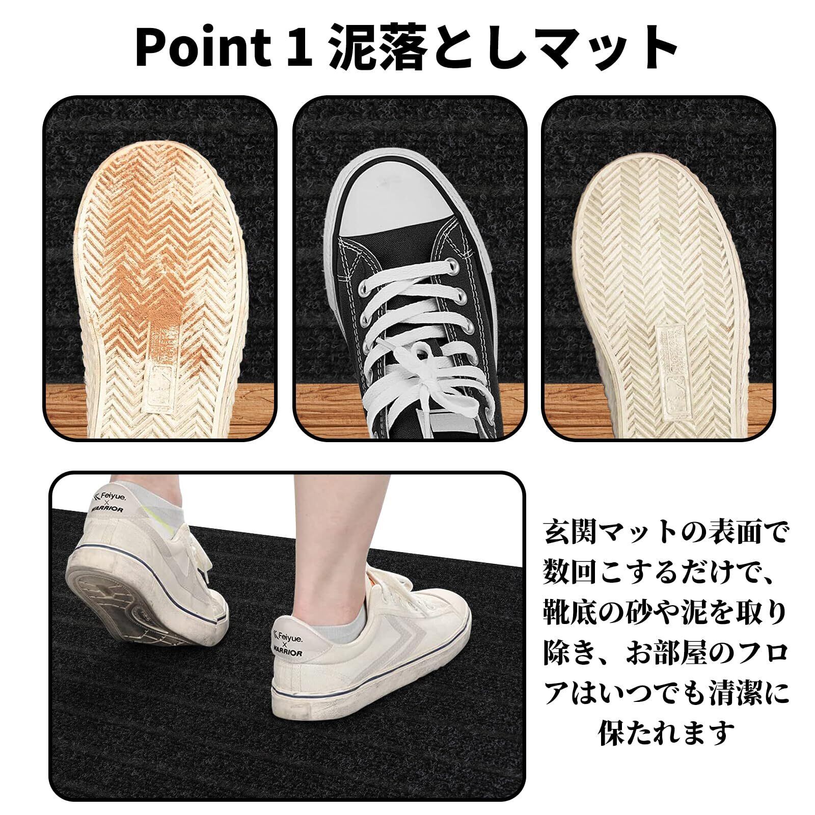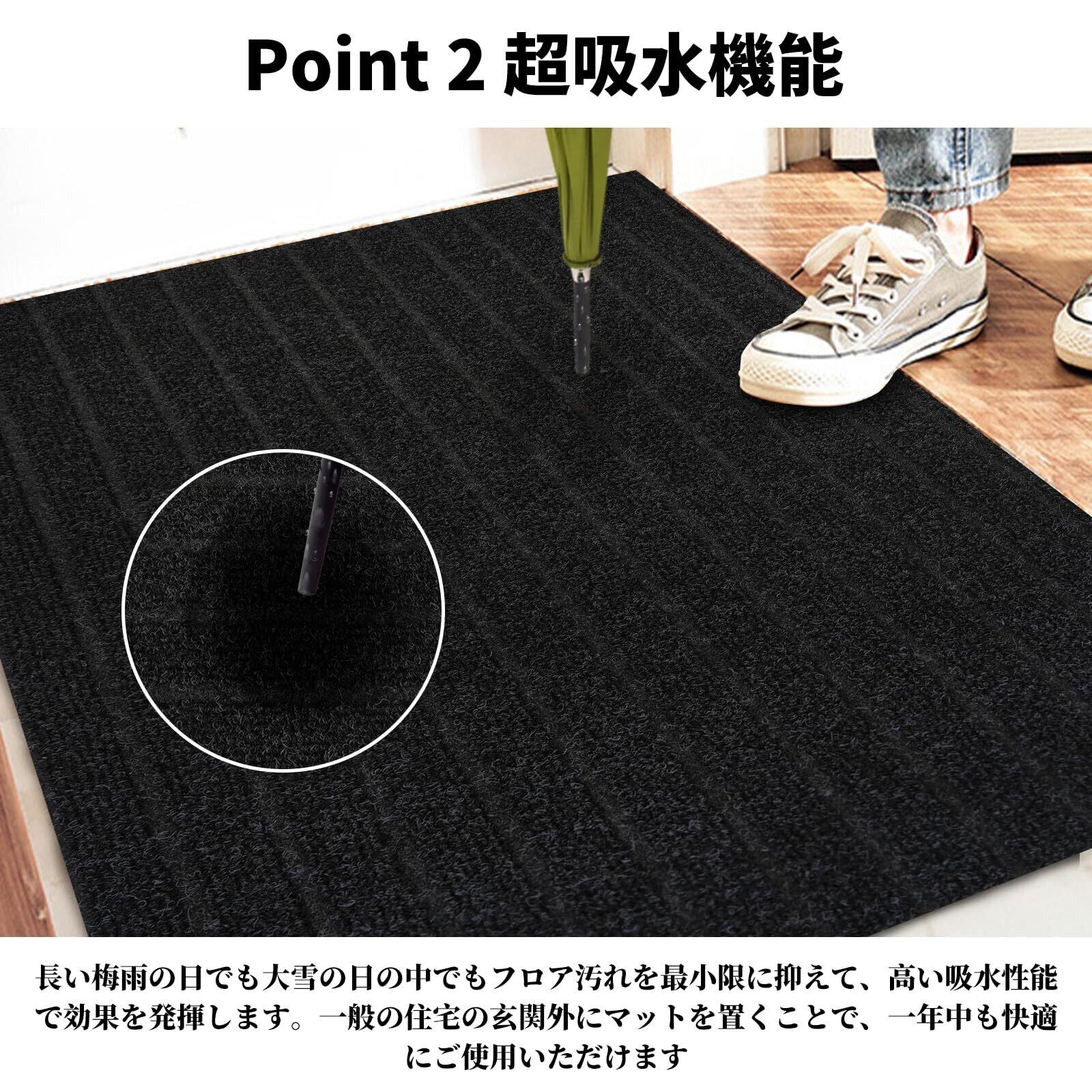 【泥落とし&吸水】屋内、屋外で泥落としマットとして使って、玄関マットの表面で数回こするだけで、靴底の砂や泥を取り除き、お部屋のフロアはいつでも清潔に保たれます。雨傘やレインコートから滴る水を瞬時に吸収、長い梅雨の日でも大雪の日の中でもフロア汚れを最小限に抑えて、高い吸水性能で効果を発揮します。一般の住宅の玄関外にマットを置くことで、一年中も快適にご使用いただけます。