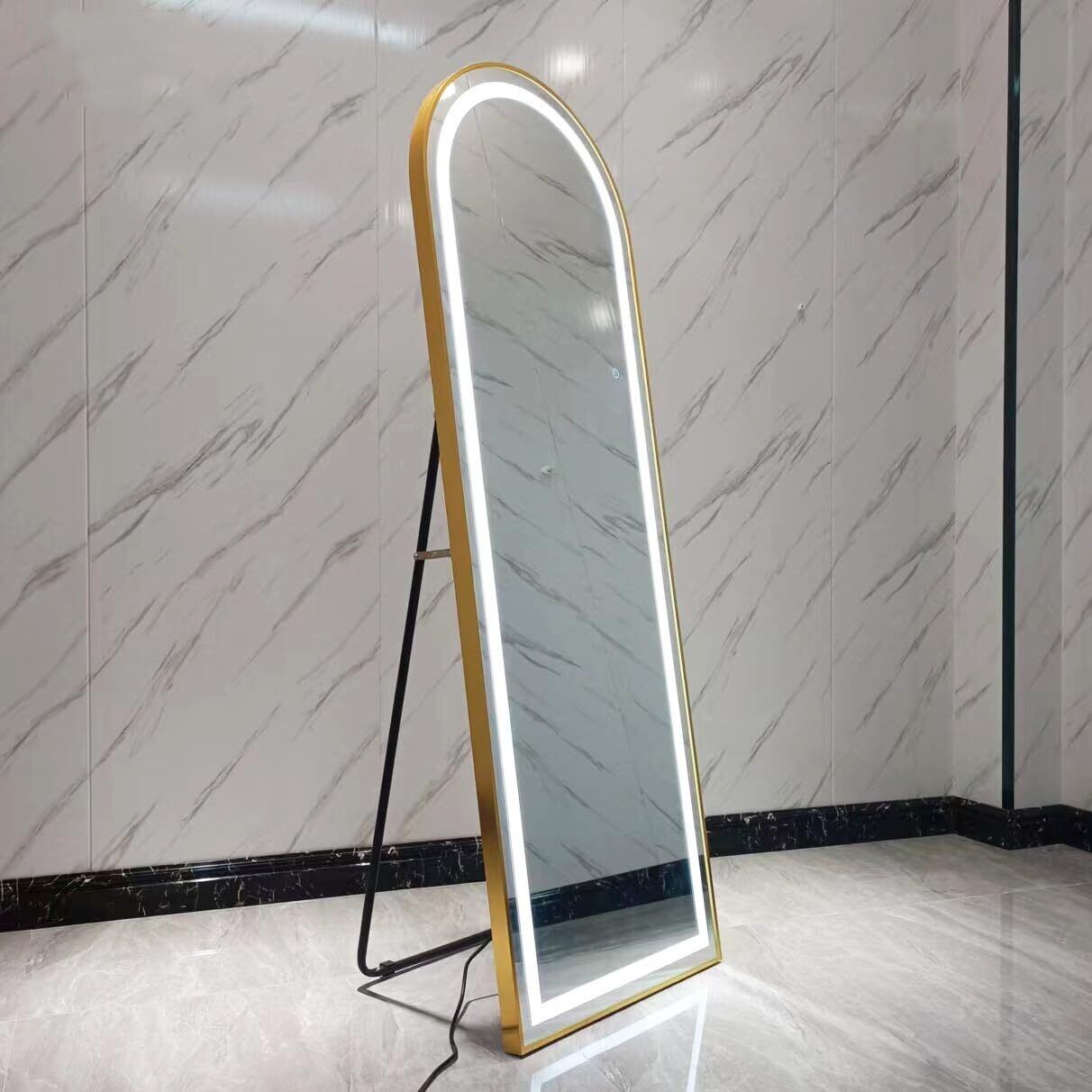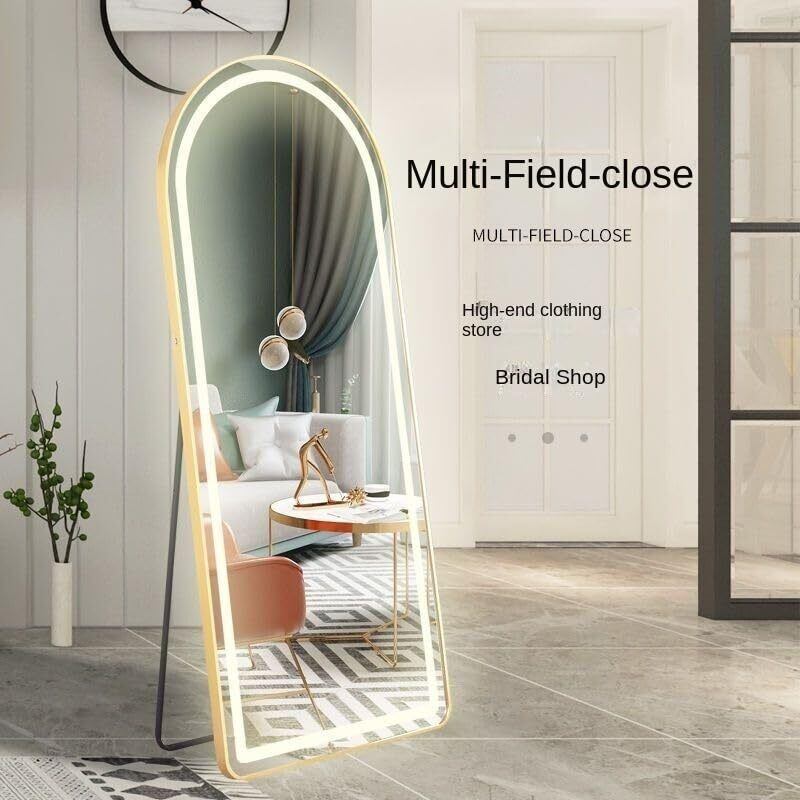 LED ミラー 姿見鏡 全身鏡 スタンドミラー アルミ合金フレーム おしゃれ アーチ型 折りたたみ 壁掛け 両用 ウォール 三色の光です 全身ミラー ライト付き 飛散防止 幅50×高さ160cm 洗面所 化粧 浴室 お風呂 玄関 (LED金色です 50CM*160CM)