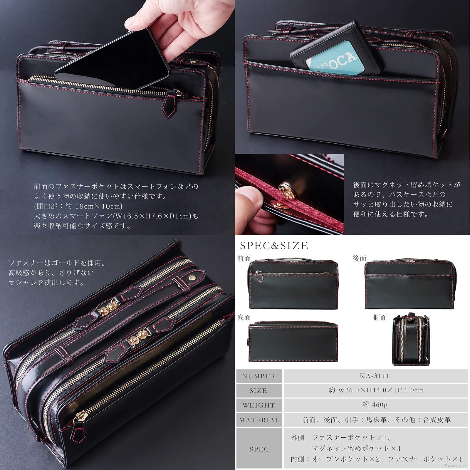 品番:KA-3111、仕様:外側/ファスナーポケット×1、マグネット留めポケット×1、内側/オープンポケット×2、ファスナーポケット×1