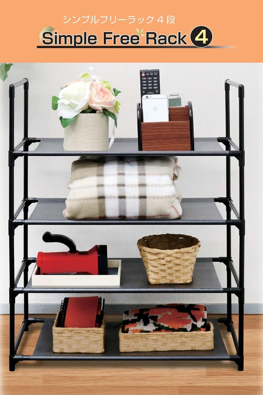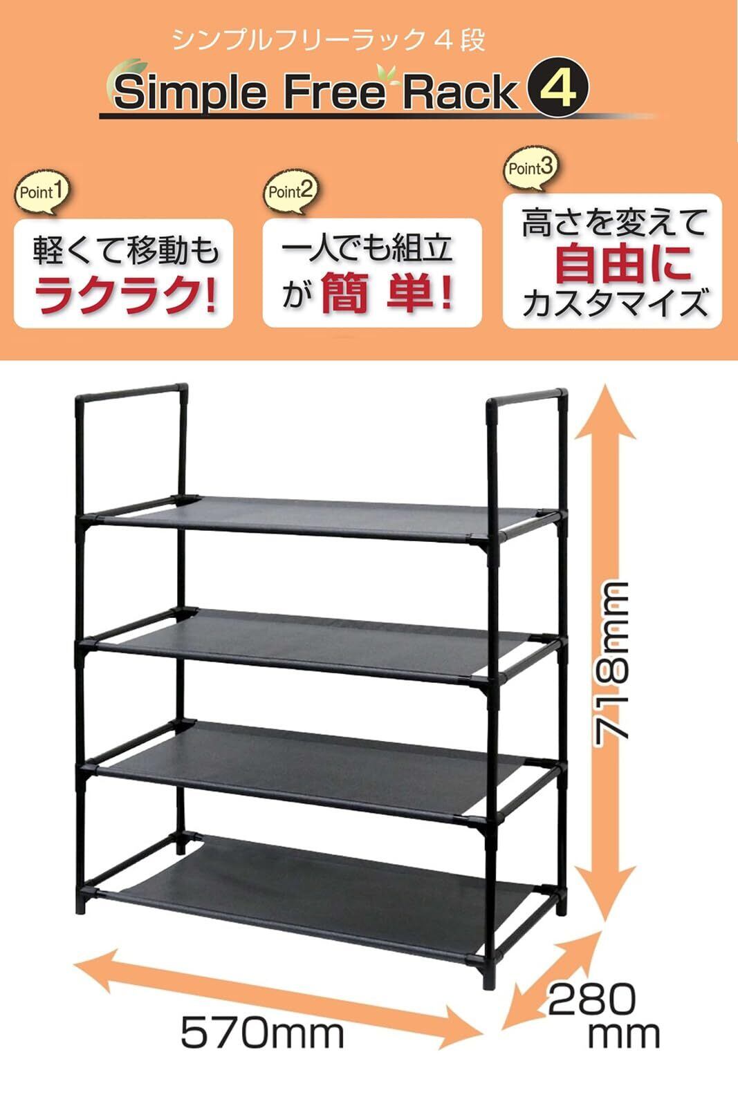 トレードワン ラック 4段 約H71.8×W57×D28cm オープンシェルフ 棚 高さ調整可能 スチール 軽量 組み立て簡単 シンプル 耐荷重4kg ブラック 10516