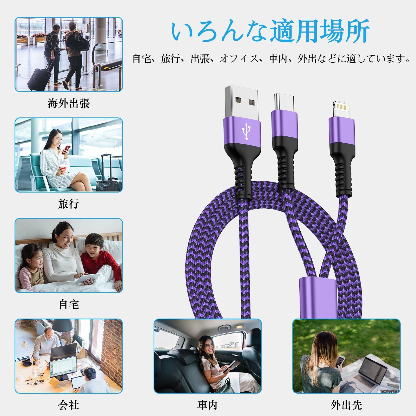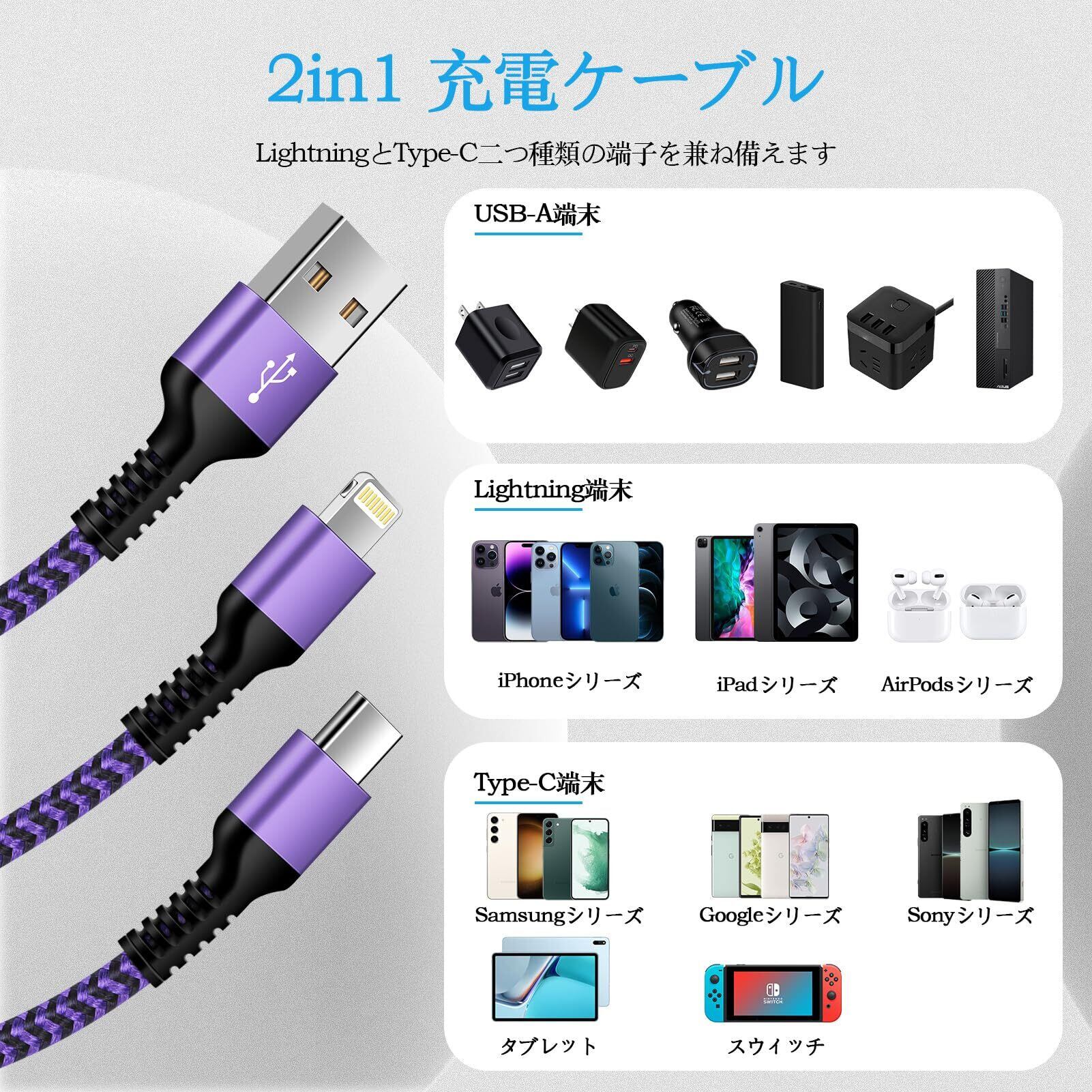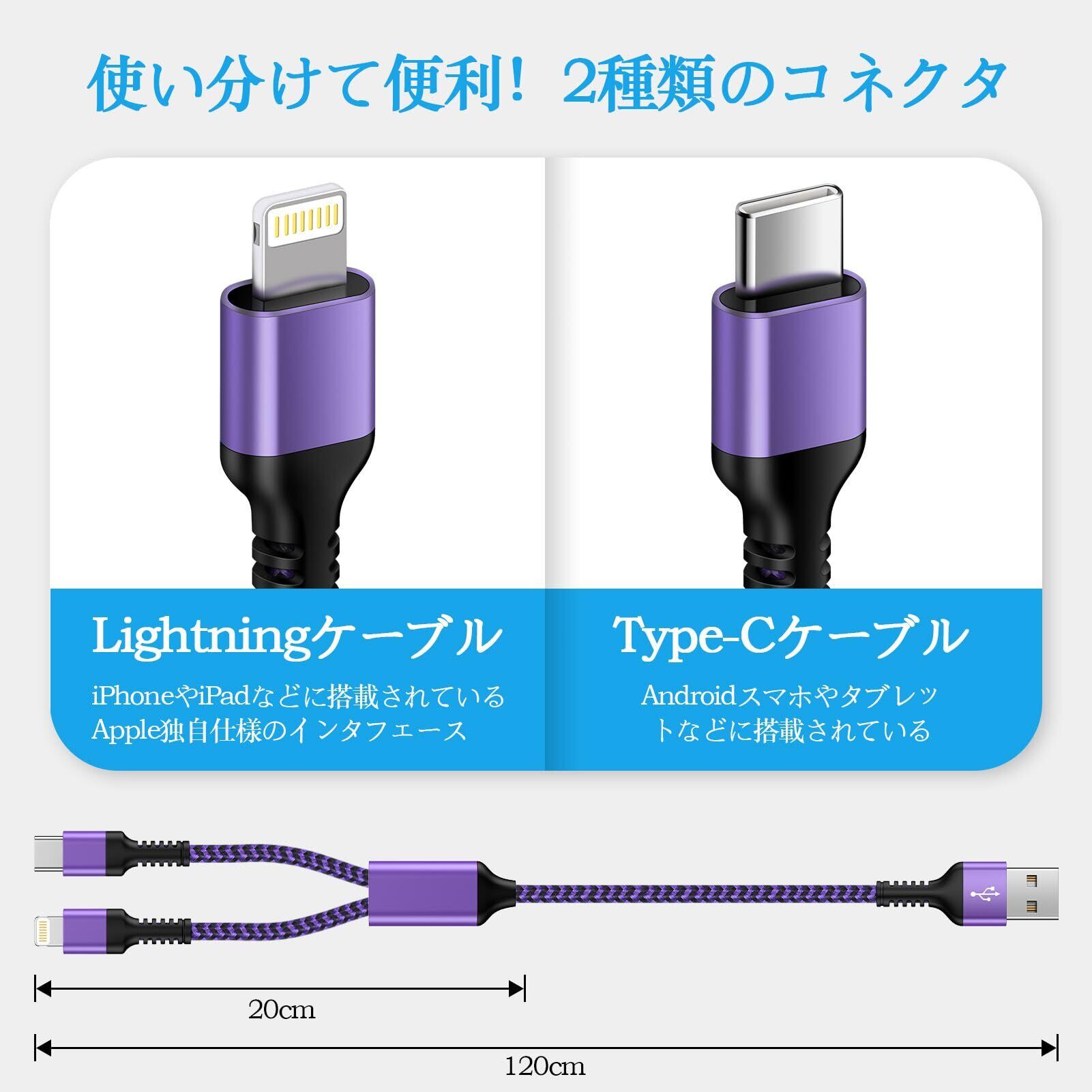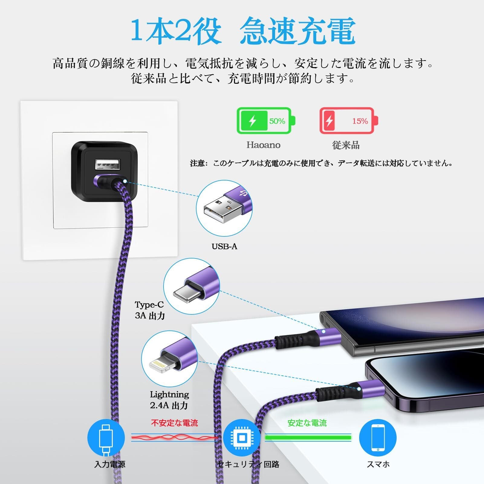 2in1 iPhone 充電ケーブル タイプc/Lightning USBケーブル 1.2M 2.4A&3A急速充電 Haoano マルチケーブル 2イン1 USB-A ライトニングケーブル 2台同時給電 iPhone 15 Pro Max/14/13/12/SE/iPad Air/Mini/Galaxy S24/S23/Google Pixel パープル