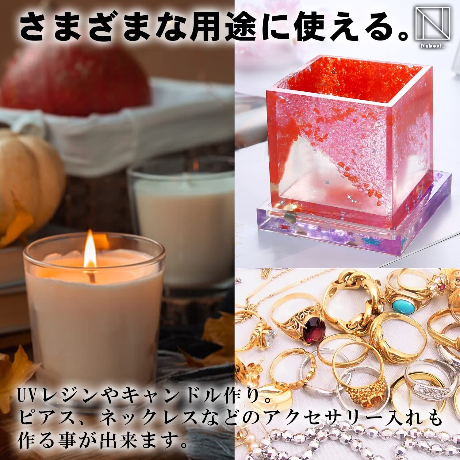 【さまざまな用途に】UVレジンやキャンドル、粘土など、いろいろな用途に使えるのでお好みの用途に合わせてご利用いただけます。ピアス、ネックレスなどのアクセサリー入れ、おしゃれなインテリアとして使えるキャンドルなどを作れます。