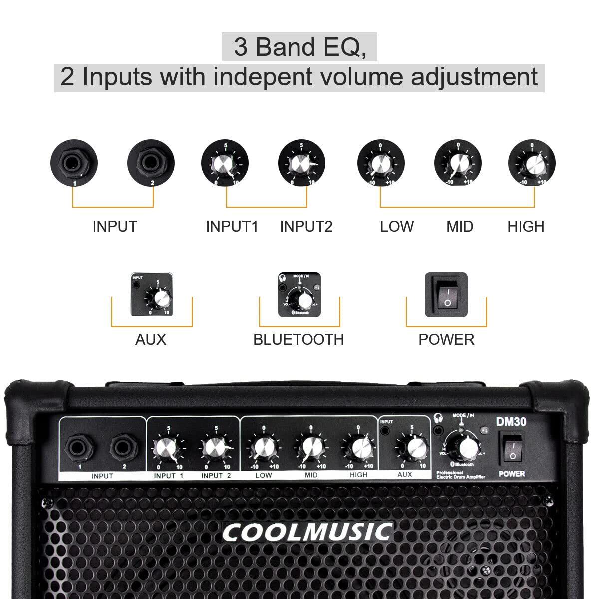 Coolmusic DM30 AMP 30 ワット電子ドラム アンプ キーボード アンプ Aux 入力と BT、2 入力、3 バンド EQ と DI 出力