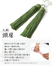 【サイズ】数珠を主に構成している珠(主珠:8mm玉)、玉の大きさが最も大きい中心的な珠(親珠:10mm玉)主珠の間にあり、略式数珠の場合は2つ(天珠:6mm玉)、人絹頭房