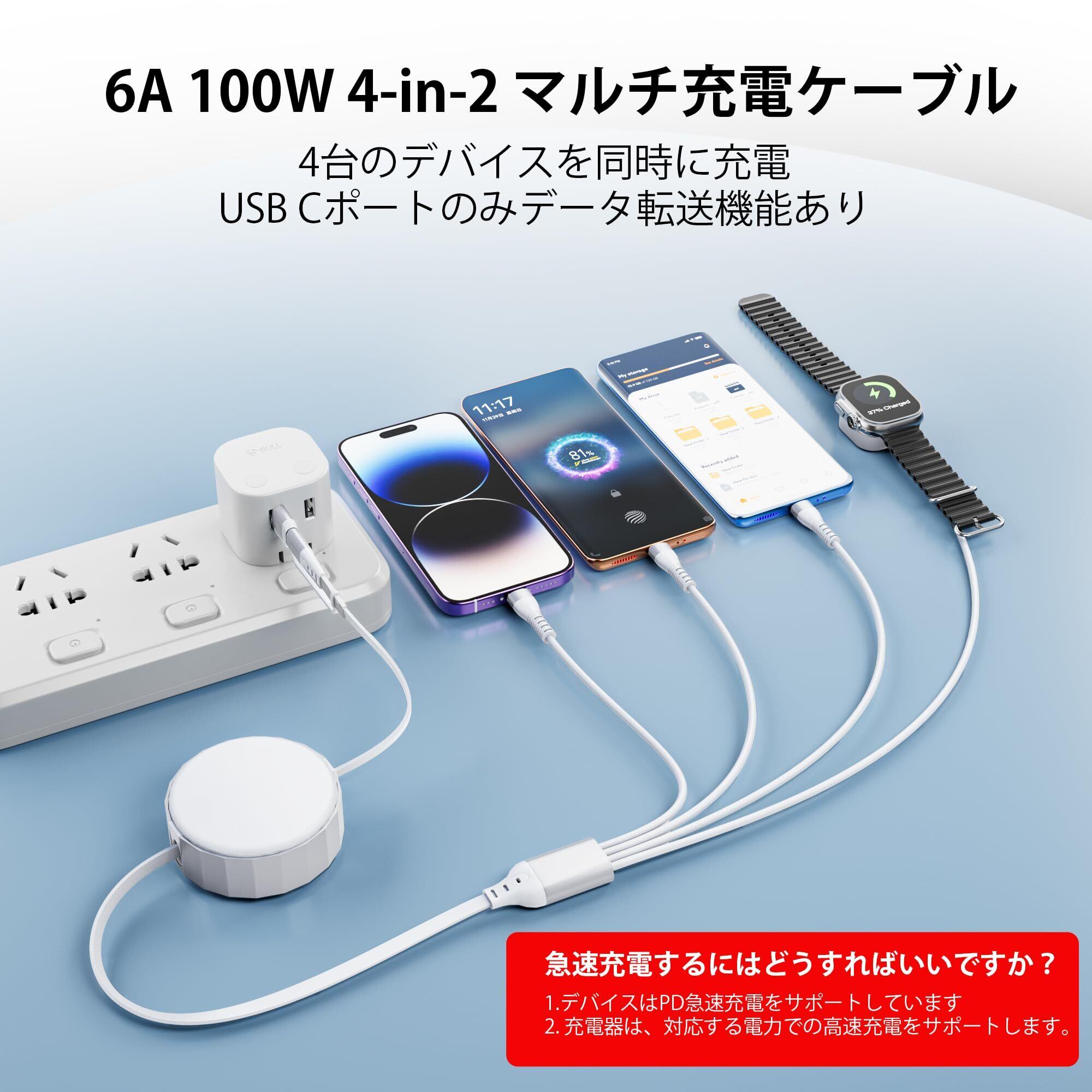 4in2 USB A+C for アップルウォッチ 充電器 Apple Watch 充電器 100WタイプC急速充電ケーブル 巻き取り式 磁気充電コード iWatch Series Ultra/SE2/10/9/8/7/6/5/4/3/2/1/SE対応,iphone アップルウォッチ 同時充電 4台同時充電持ち運び便利 軽量