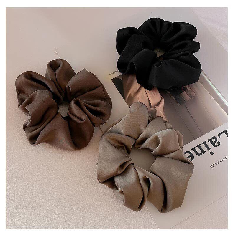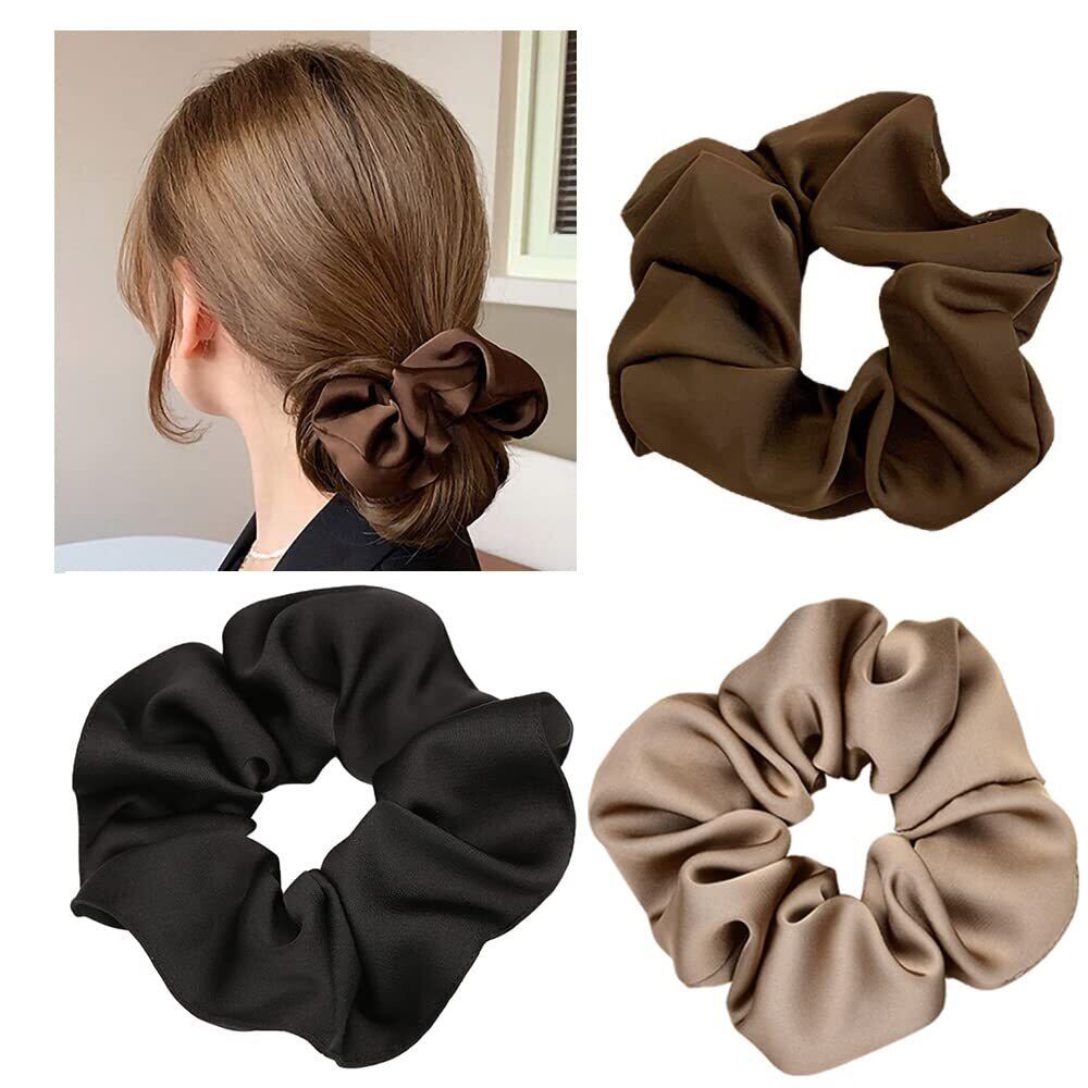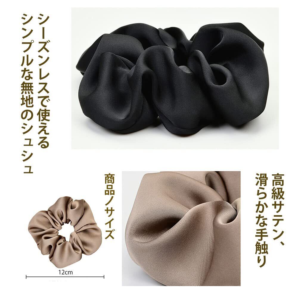 シュシュ ヘアゴム シュシュおしゃれ 大人 ボリューム 大きめ サテンシュシュ 無地 シンプル 髪飾り レディース エレガント ヘアアクセサリー 3点セット【RAINY LEMON】 (A: ブラック + キャメル + ベージュ, L)