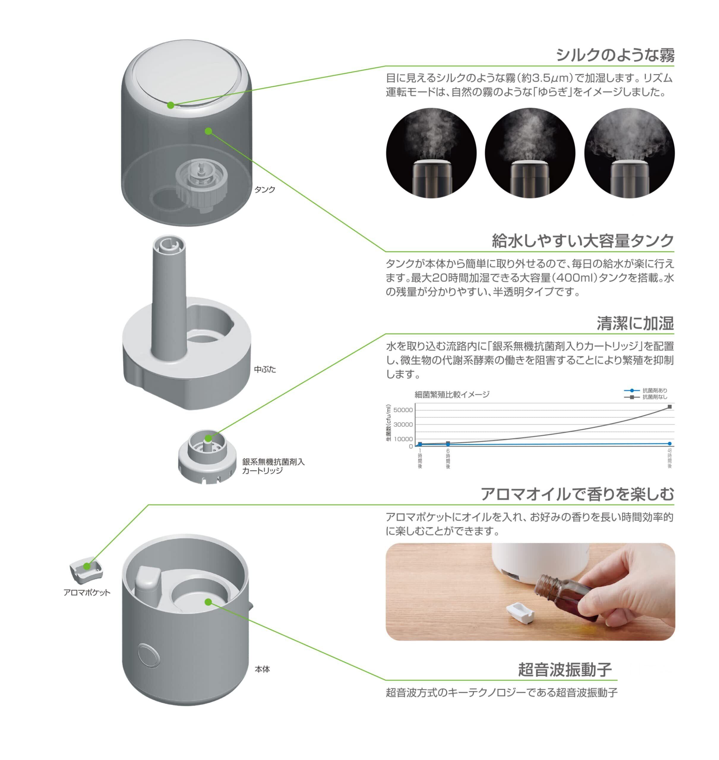 電源:専用ACアダプター(入力:AC100 V 50/60 Hz) 消費電力:最大8.4W(連続運転時) 加湿方式:超音波振動式 運転モード:2種類(リズム|連続) ※リズム運転:一定間隔で加湿を繰り返します 加湿量:リズム・約50ml /h |連続・約100ml/h 連続加湿時間:リズム・約8h|連続・約4h タンク容量:約400ml 適用床面積:プレハブ洋室4.5㎡(2.8畳)まで・木造和室2.7㎡(1.7畳)まで。 照明:LED(OFF付 ※電源ボタン2長押しで消灯。