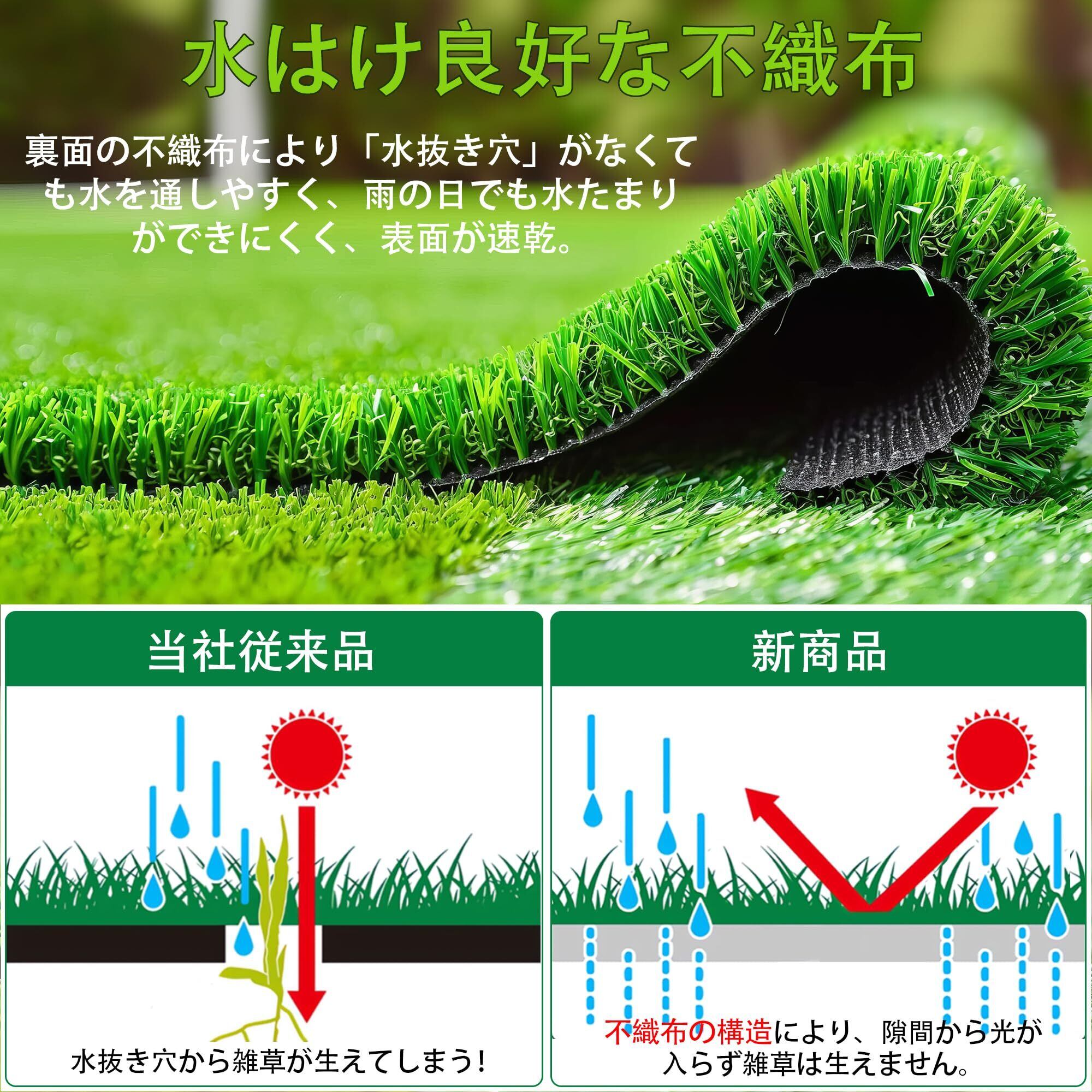水はけ良好な不織布構造:「V字パイル加工」の人工芝は、驚異的な強靭性を誇り、草が透水孔から生える問題を新しい不織布材料で解決しました。これにより、効果的な排水が実現され、大雨の中でも快適にご使用いただけます。また、耐久性と低メンテナンス性にも優れ、紫外線や雨水などの悪天候にも対応し、簡単にお手入れできます。