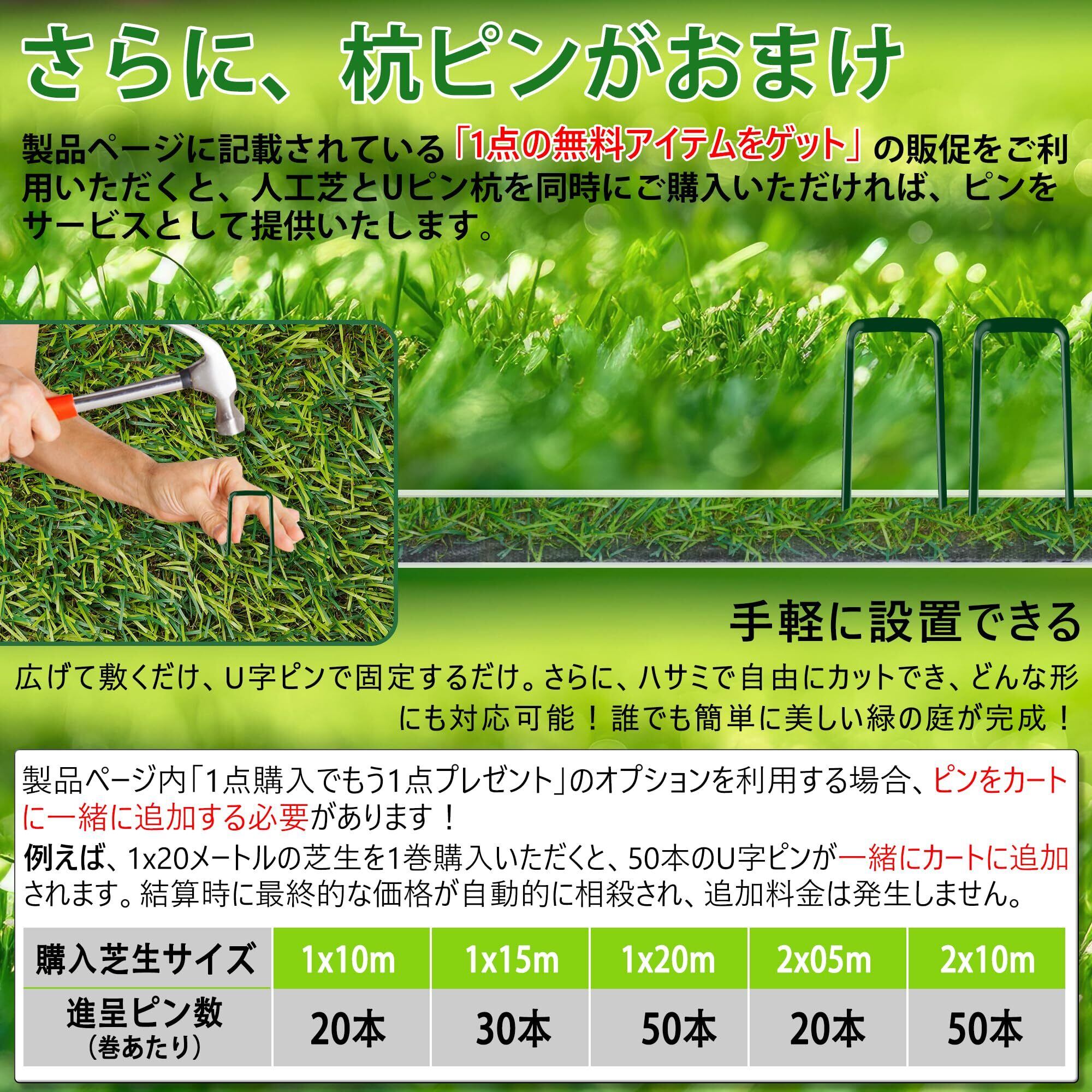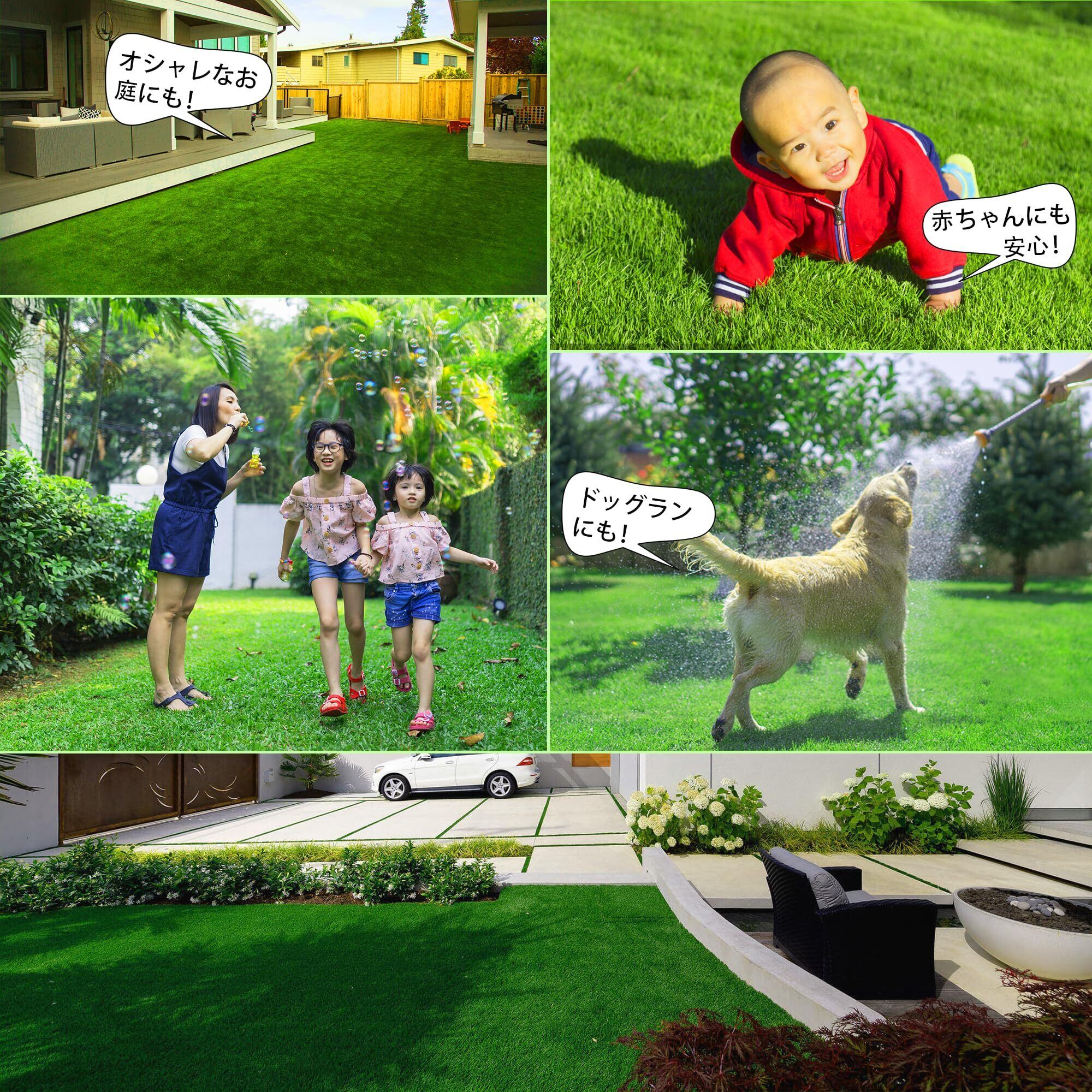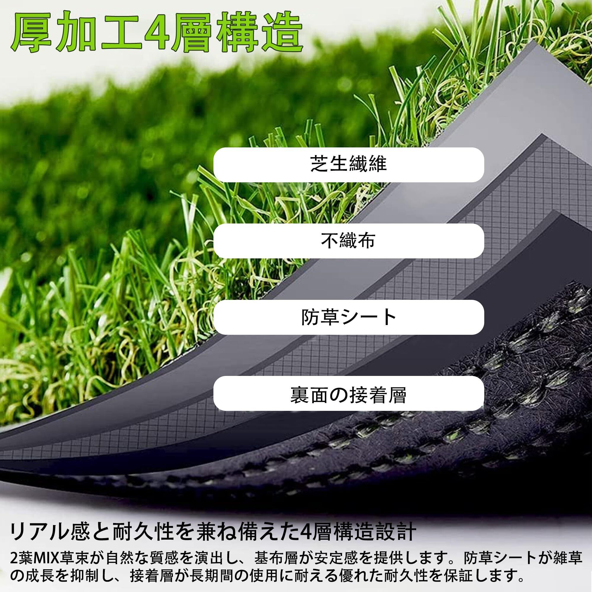 まるで天然芝のような美しさ:人工芝は1m×2mのサイズ、重さ約2.5kgで、高密度・耐久性に優れた4層構造を採用。つや消し・UVカット加工、低ホルムアルデヒド素材を使用し、優れた性能を発揮します。