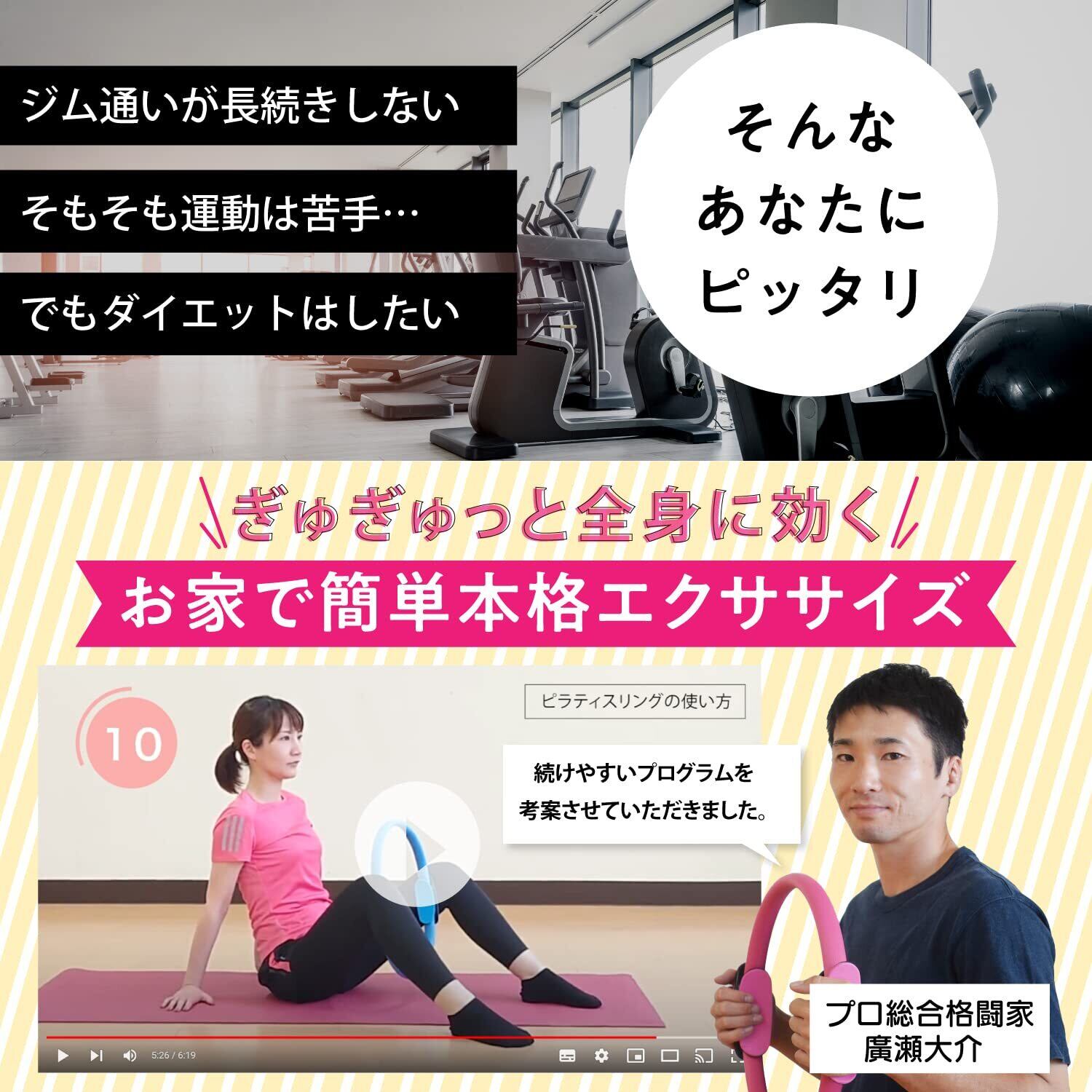 【プロ格闘家もオススメ!美ボディリング】 ヨガリング・ピラティスリングなどのフィットネスツールとして運動効果を高め、スッキリ美ボディを目指します。 プロ総合格闘家監修の使い方説明書付きだから、初心者でも簡単にトレーニングOK! 薄型&コンパクトでかさばらずに収納でき、持ち運びも楽々。 自宅での家事の合間やオフィスでの休憩中、ジムやスクールなどいつでも・どこでも気軽にお使いいただけます。
