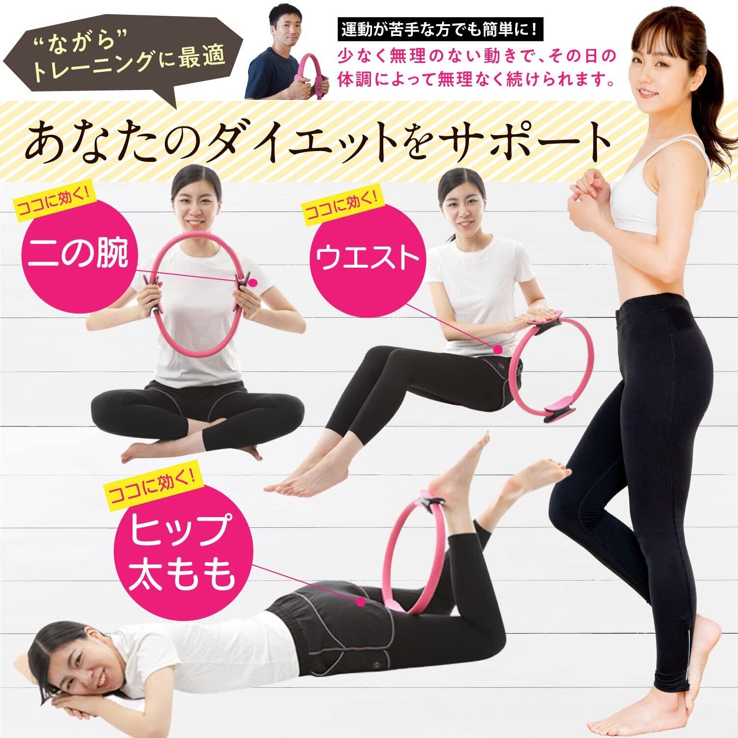 【プロもオススメ!美ボディリング】ヨガリング・ピラティスリングなどのフィットネスツールとして運動効果を高め、 スッキリ美ボディを目指します。プロ総合格闘家監修の使い方説明書付きだから、初心者でも簡単にトレーニングOK! 薄型&コンパクトでかさばらずに収納でき、持ち運びも楽々。 自宅での家事の合間やオフィスでの休憩中、ジムやスクールなどいつでも・どこでも気軽にお使いいただけます。 【使い方は色々】様々な使用方法で気になる部分に引き締めアプローチ! 手に持ったり脚に挟んだりしながら、押す・引くなどの動作を加えて効果的にインナーマッスルを鍛えます。 まずは1日15分のトレーニングから始め、背中、二の腕、腹筋や脇腹、バスト、ウエスト、ヒップ、 骨盤底筋、太もも、ふくらはぎ、肩など全身のストレッチや筋トレにお使いいただけます。 【高機能で快適な使用感】軽量かつ丈夫なグラスファイバーを採用し、 優れた弾力性と滑り止め付きで負担の少ないエクササイズが可能です。 人間工学に基づき設計されたグリップは、柔らかく握りやすい形状でフィット感バツグン。力の弱い女性にも優しい仕様です。 【こんな方に】体力に自信の無い方、運動が苦手な方も無理の無い動きでながらトレーニングが可能です。 なかなかダイエットの効果が出ない方、厳しい食事制限や筋トレを行わず自分のペースでエクササイズしたい方。 忙しくてジムに通えない方。体幹強化、バストアップ、代謝向上、筋膜リリース、ストレス解消に。 【国内検品&メーカー保証30日】日本人スタッフが国内にて一つ一つ丁寧に検品の上、梱包・発送を行っておりますが、 万が一初期不良等お品物にご満足いただけなかった場合は、メーカーによる品質保証をさせていただきます。 商品到着後30日以内に限り、日本人スタッフが保証規定に基づき返品対応をいたしますので、サポートまでご連絡ください。