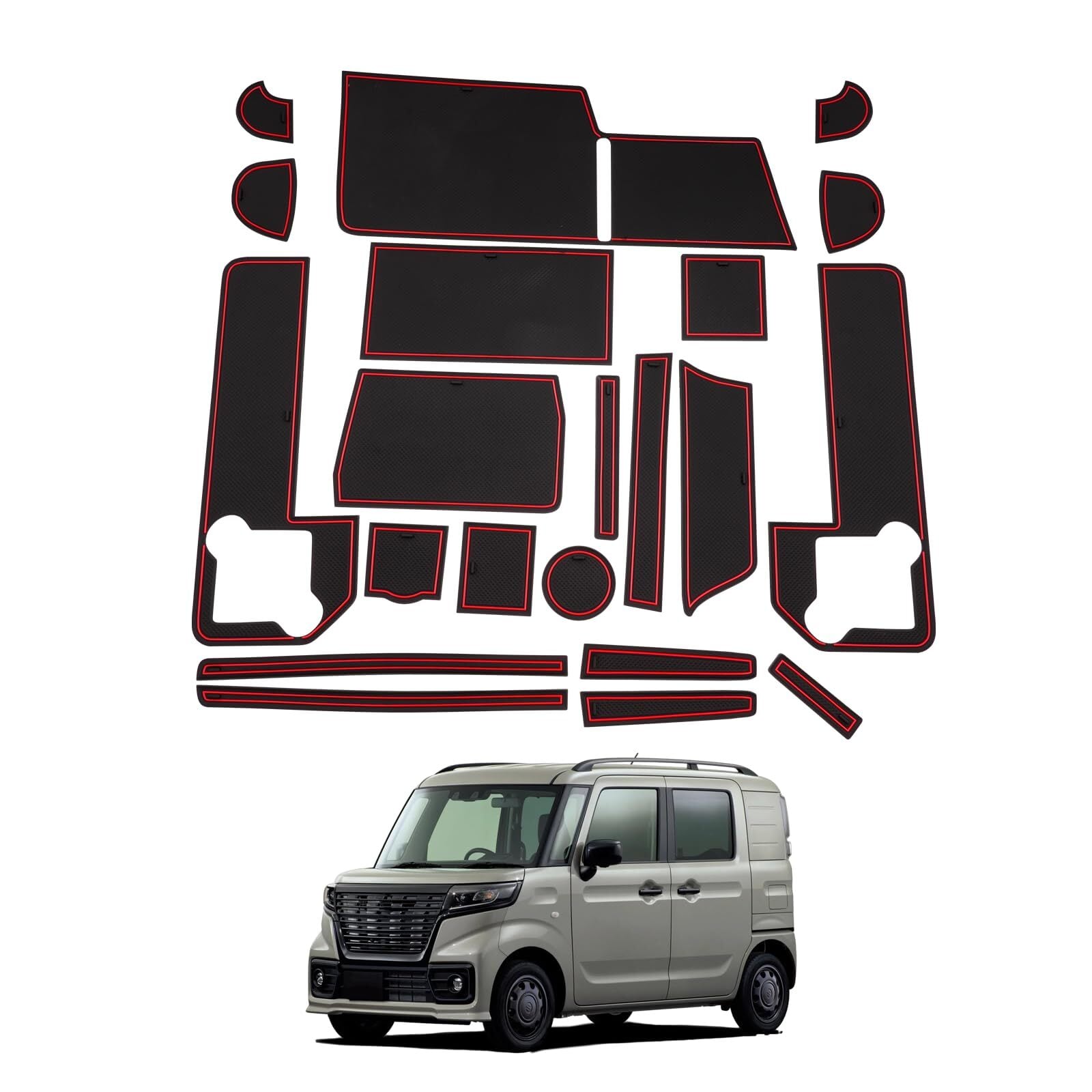 対応車種:スズキ SPACIA スペーシア MK54S MK94S 2023.11~/スズキ スペーシアカスタム SPACIA CUSTOM 3代目 MK54S/94S型 2023.11~。インテリアラバーマット 21枚入り(車のグレードやオプション等により部分ピースは余る可能性があります)。