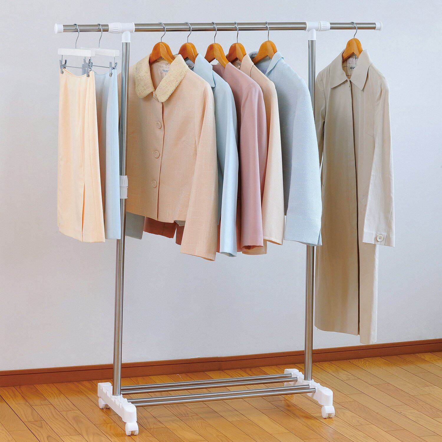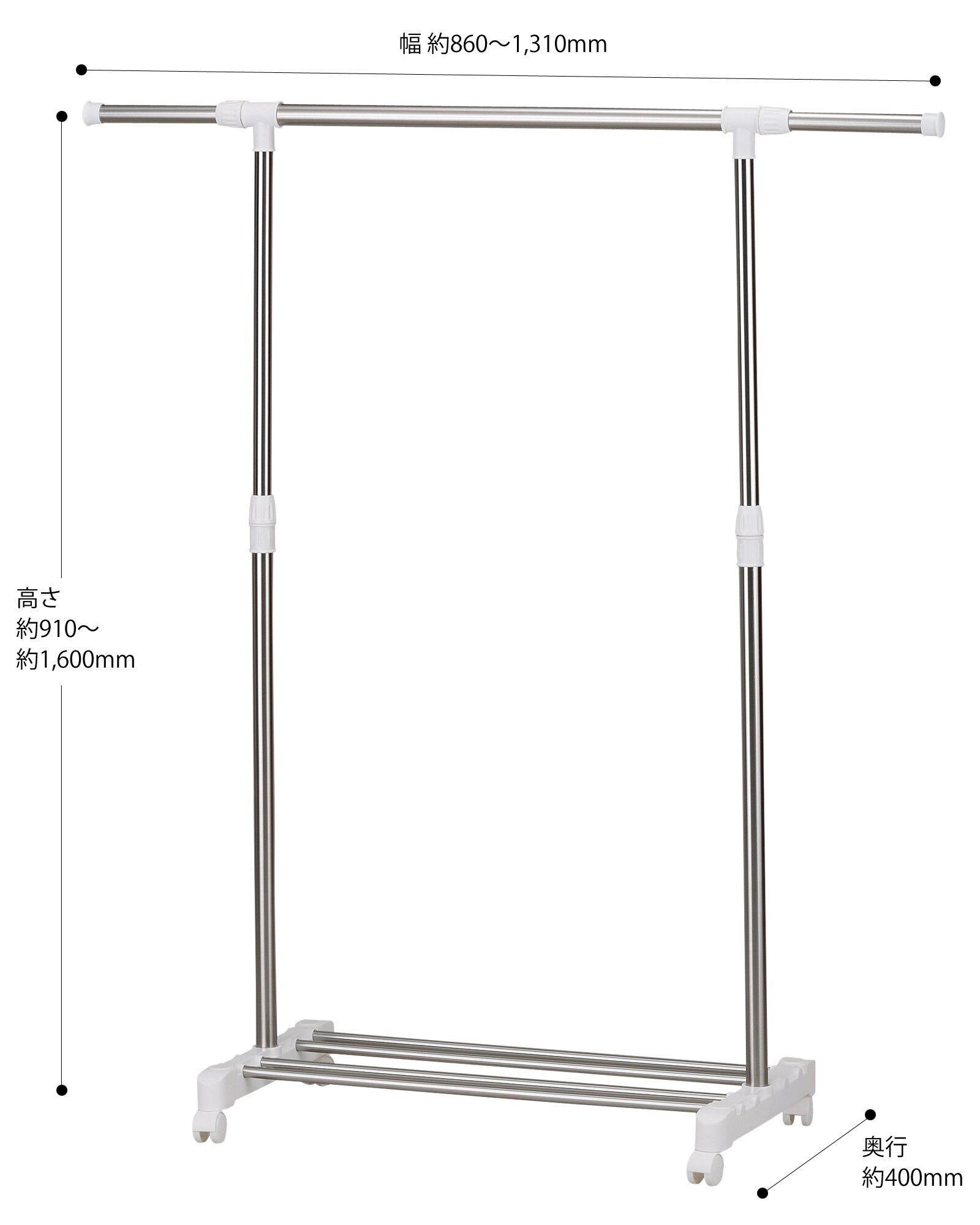 衣類に合わせて高さと幅を調節できます。 キャスター付きで移動に便利です。 ワイシャツで約10着、ジャケットなら約8着が掛けられます。 工具不要の組立式。 パイプを太くして強度アップ。