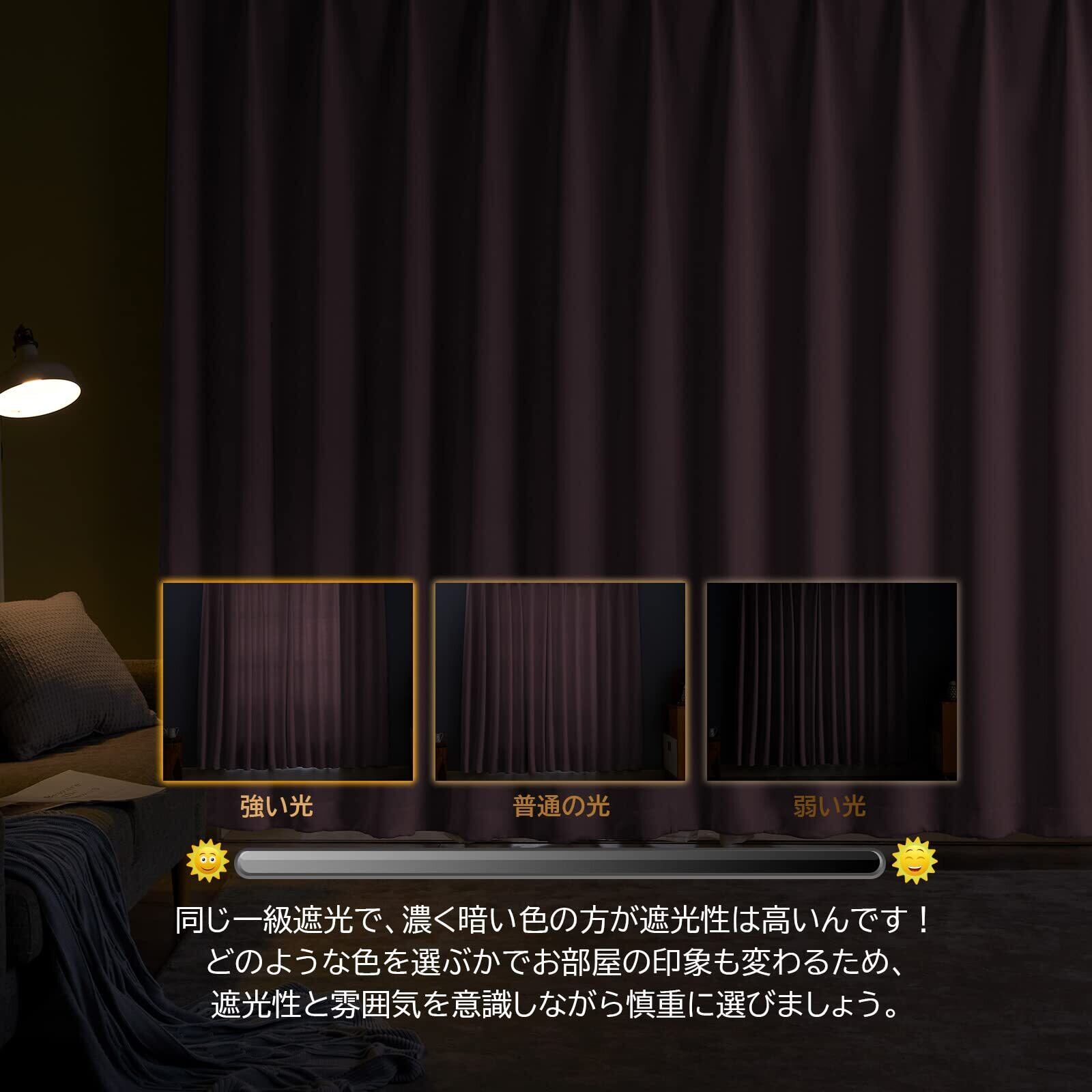 ◆【一級遮光】このカーテンは遮光度が99.99%以上,外からの光をほとんど通さないため、昼間カーテンを閉めたお部屋のなかで相手の顔の表情が分からない程度にまでお部屋を暗くできます。同じ等級であっても、カーテンの明度や色彩によって遮光の度合いが変わります。薄い淡い色は光を通しやすく、濃い暗い色は光を通しにくいです。遮光性を重視される方は濃色をおすすめします。