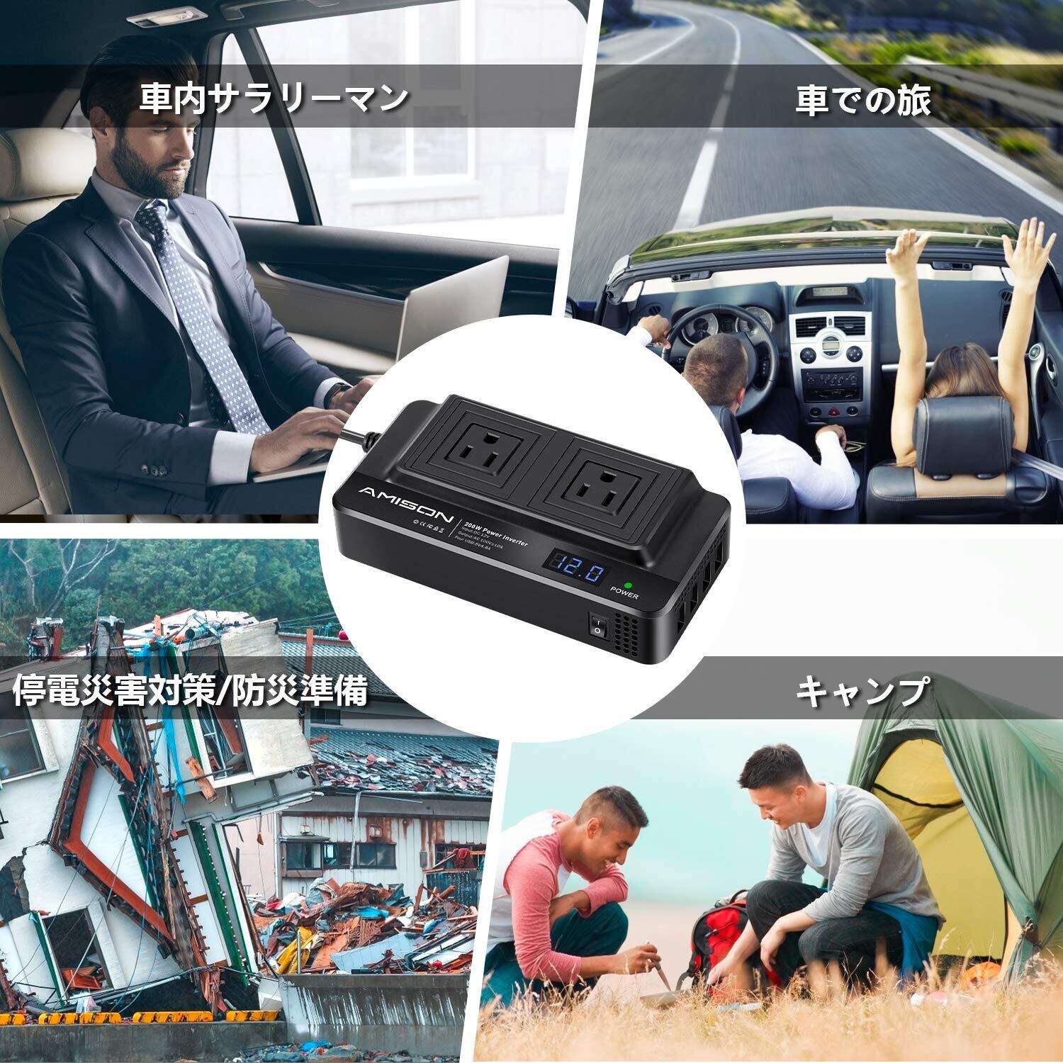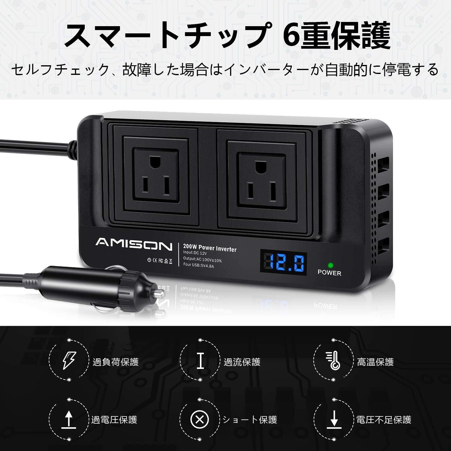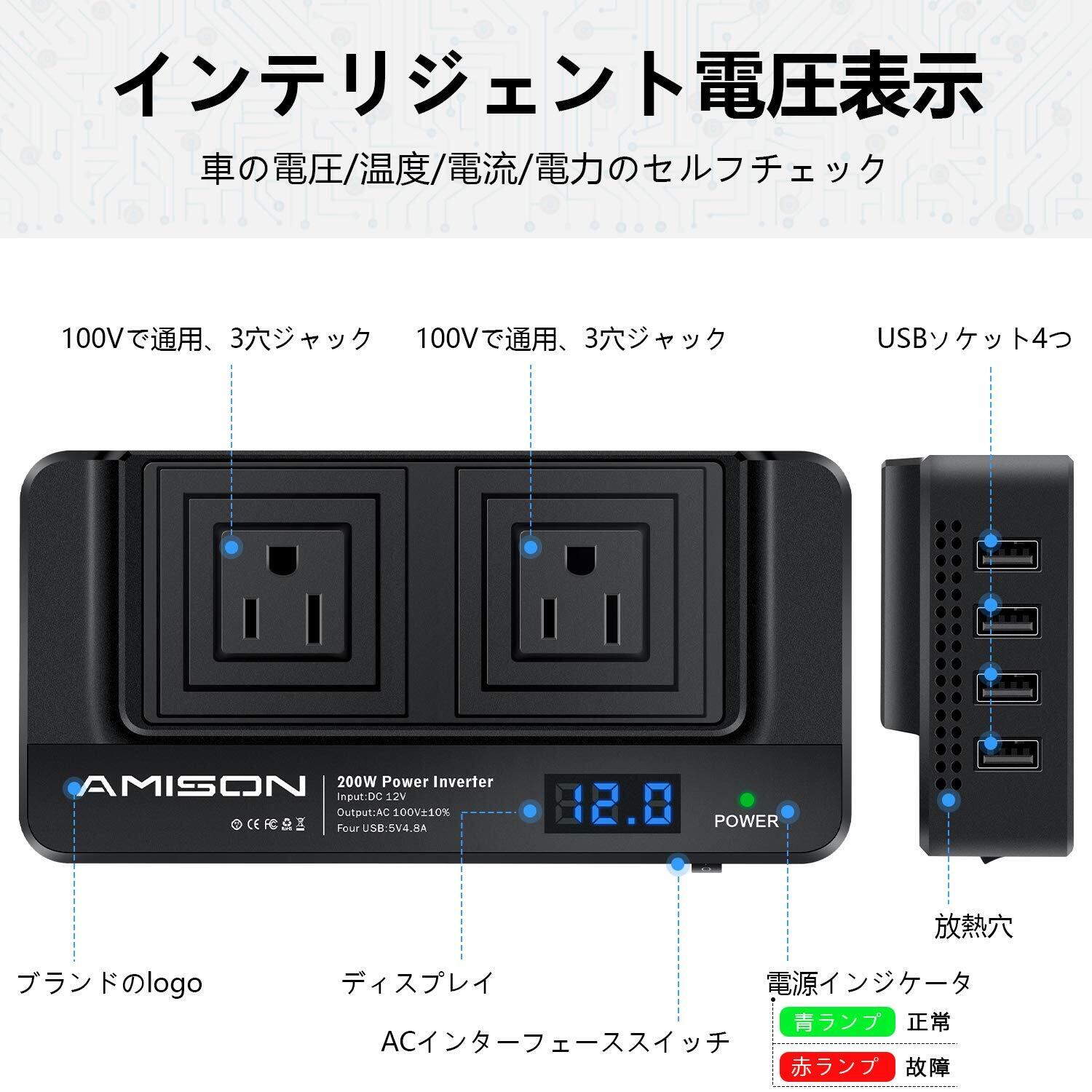 Amison インバーター 200w シガーソケットコンセント カーコンバーター DC12V /AC 100Vに変換 車載充電器 ACコンセント2口 USB 4ポート