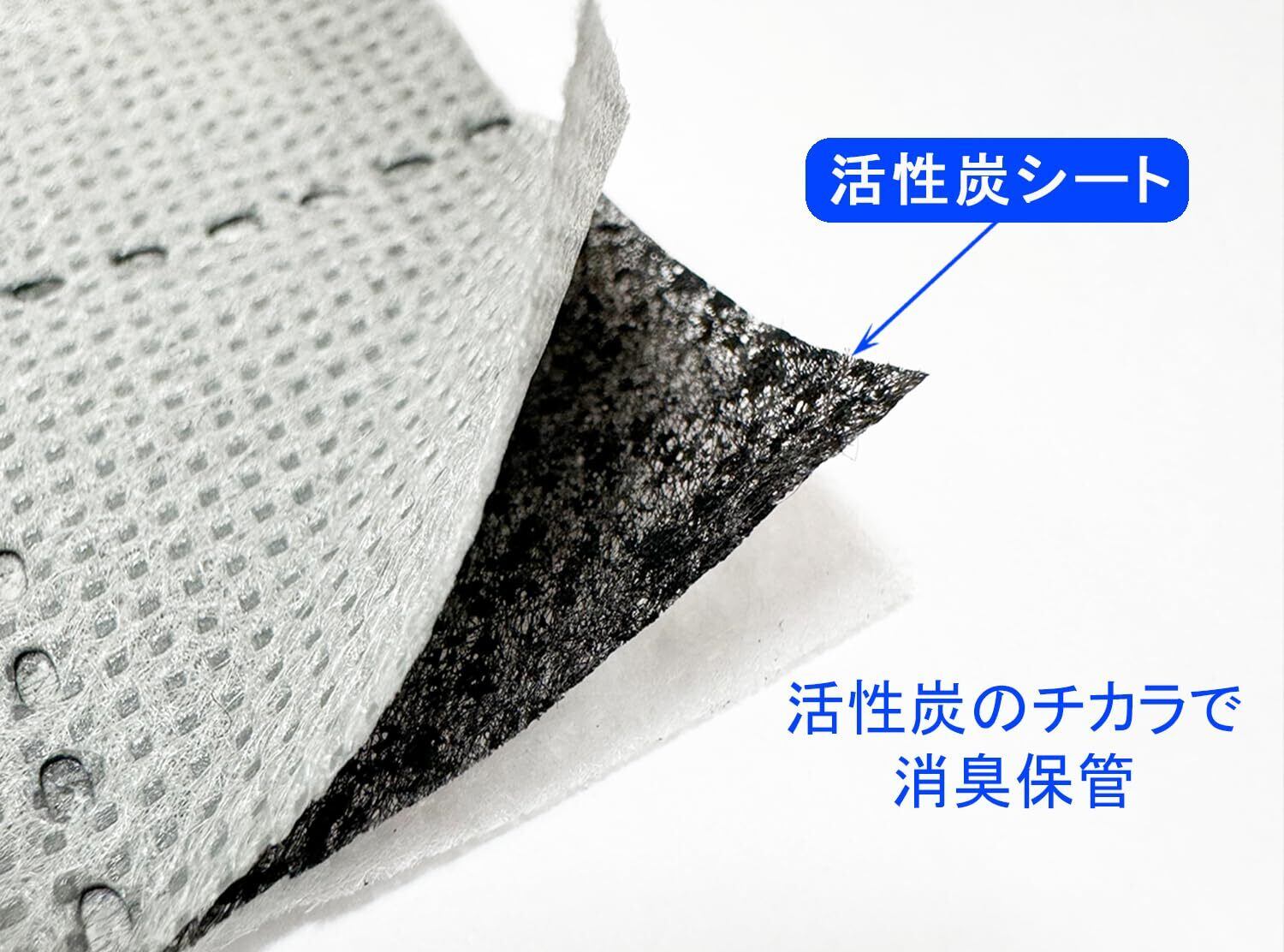 ・サイズ:35×48×20cm。素材:通気性に優れた不織布の間に活性炭シートを挟んだ生地を使用。