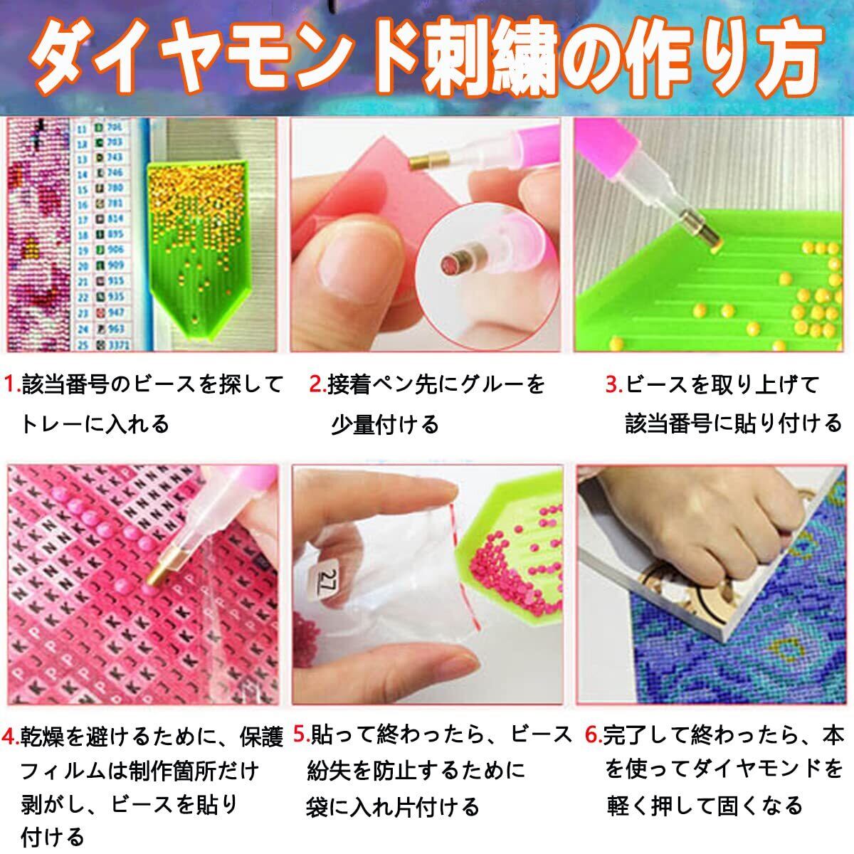 【ダイヤモンドアート キット内容】--1枚セットの5Dダイヤモンドアート、1枚のラベルステッカー、4個のグルー、3本のダイヤモンドペン、1個のビーズトレイ。(ダイヤモンドビーズの不足を避けるために、ビーズの数を30%増やしました。)本セットがあれば手軽にダイヤモンドアートを始めれます。