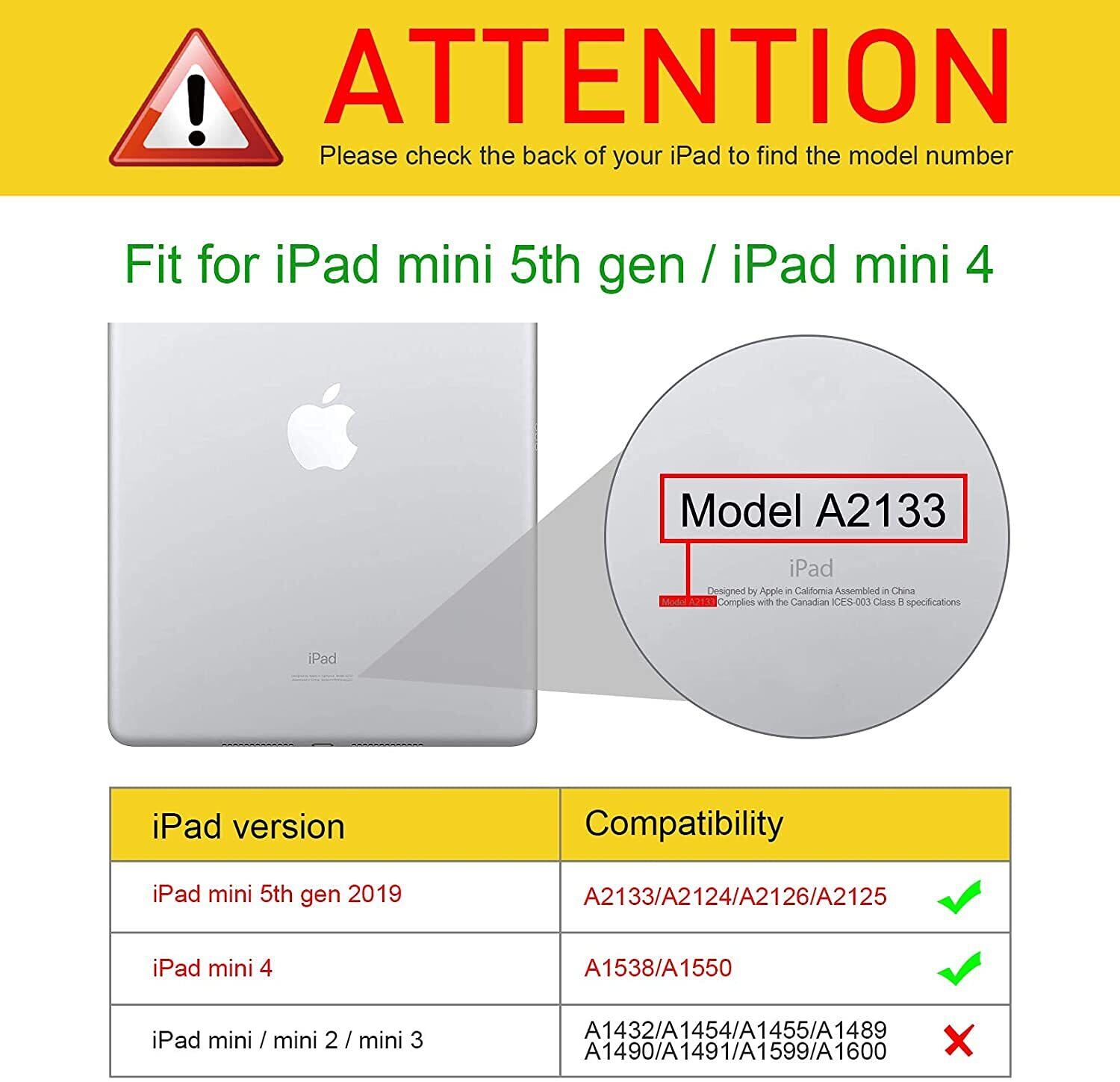 ➤【適用機種】 Apple iPad Mini5 (型番A2133、A2124、A2126、A2125)とMini4 (型番A1538、A1550)用に設計されています。穴の位置がすべて正確ですので、すべてのボタンを簡単に押すことができ、電源ボタン、音量ボタン、スピーカー穴等、iPadを隅々までカバーし、非常に優れた保護力を発揮。注意:Mini1/2/3に適用できないので、ご購入の前にお手持ちのiPadモデルをご確認ください。