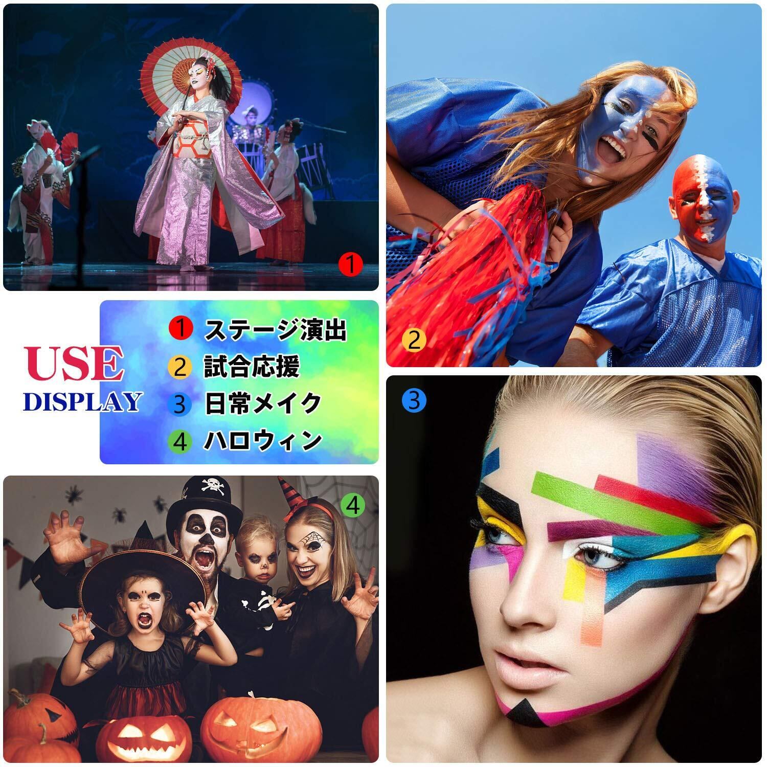 ✎【多機能】顔はもちろん、手、体にも使えるペイントです。ハロウインやクリスマスのコスプレ小道具、スポーツ観戦応援グッズ、仮装パーディーや舞台演出などのメイクアップグッズとして大活躍間違いなし。学校、教会、祭典、フェスティバル、カーニバル、誕生日、劇場など様々な場合に最適です。