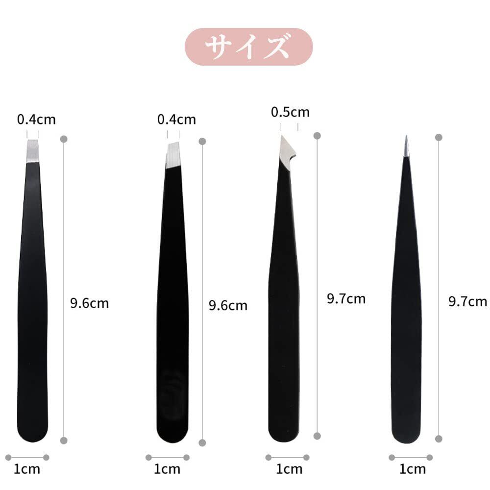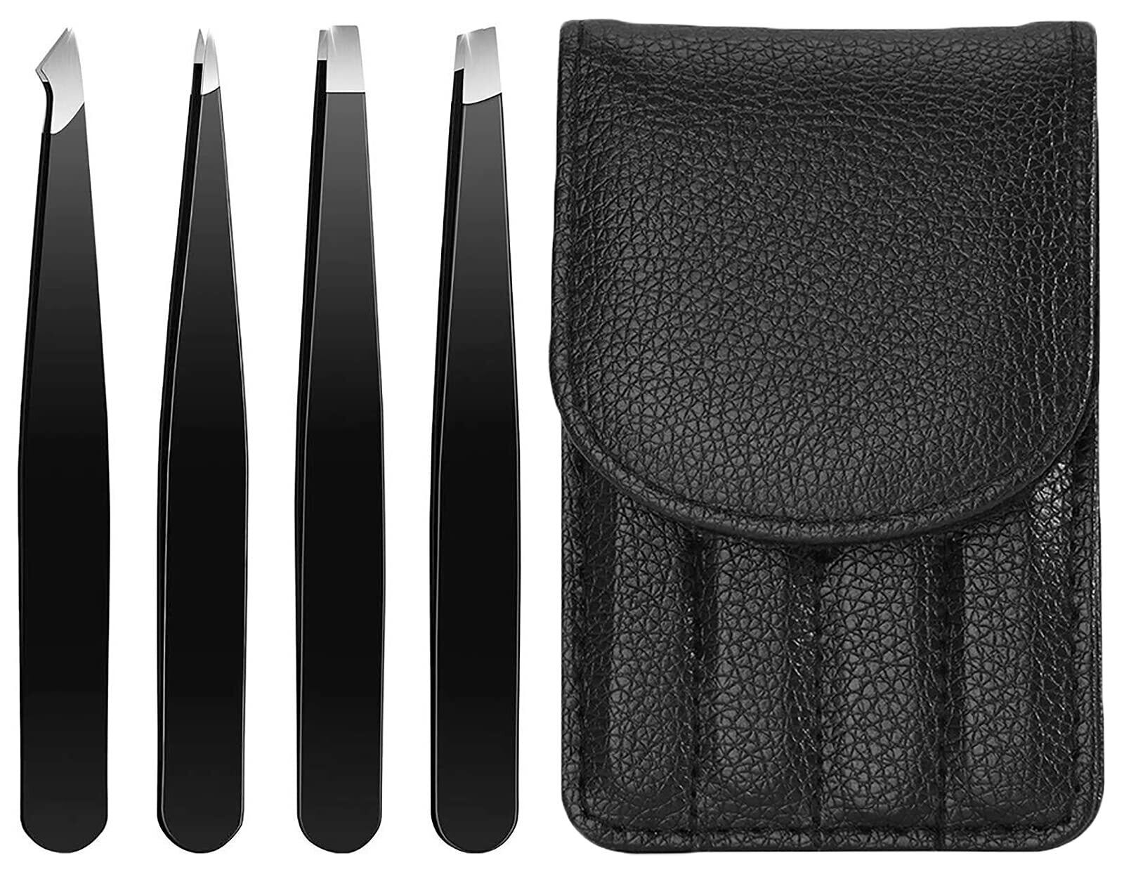 毛抜き 4本セット 精密 ピンセット ステンレス製 先斜め 先細 平タイプ 眉毛用 顔 角質取り 角栓取り 耳毛処理 鼻毛 ヒゲ レザーケース付き (ブラック)