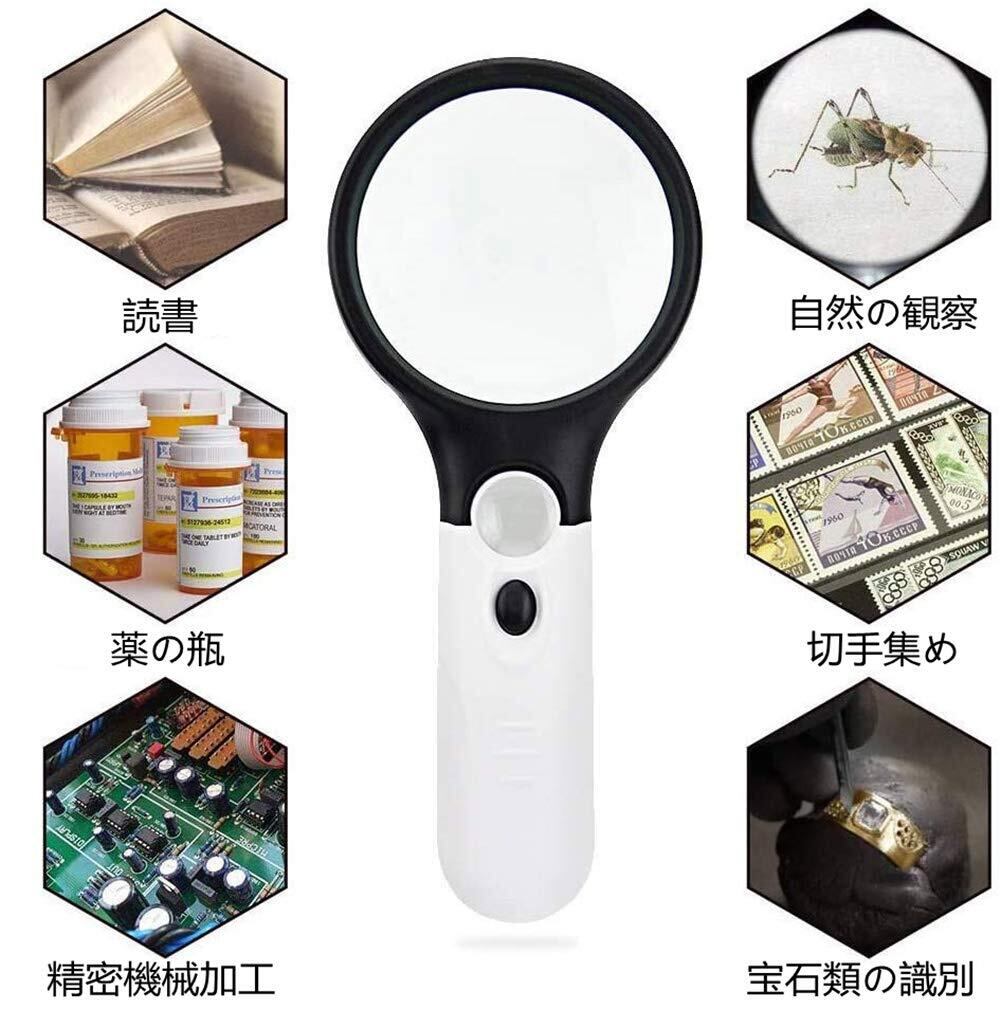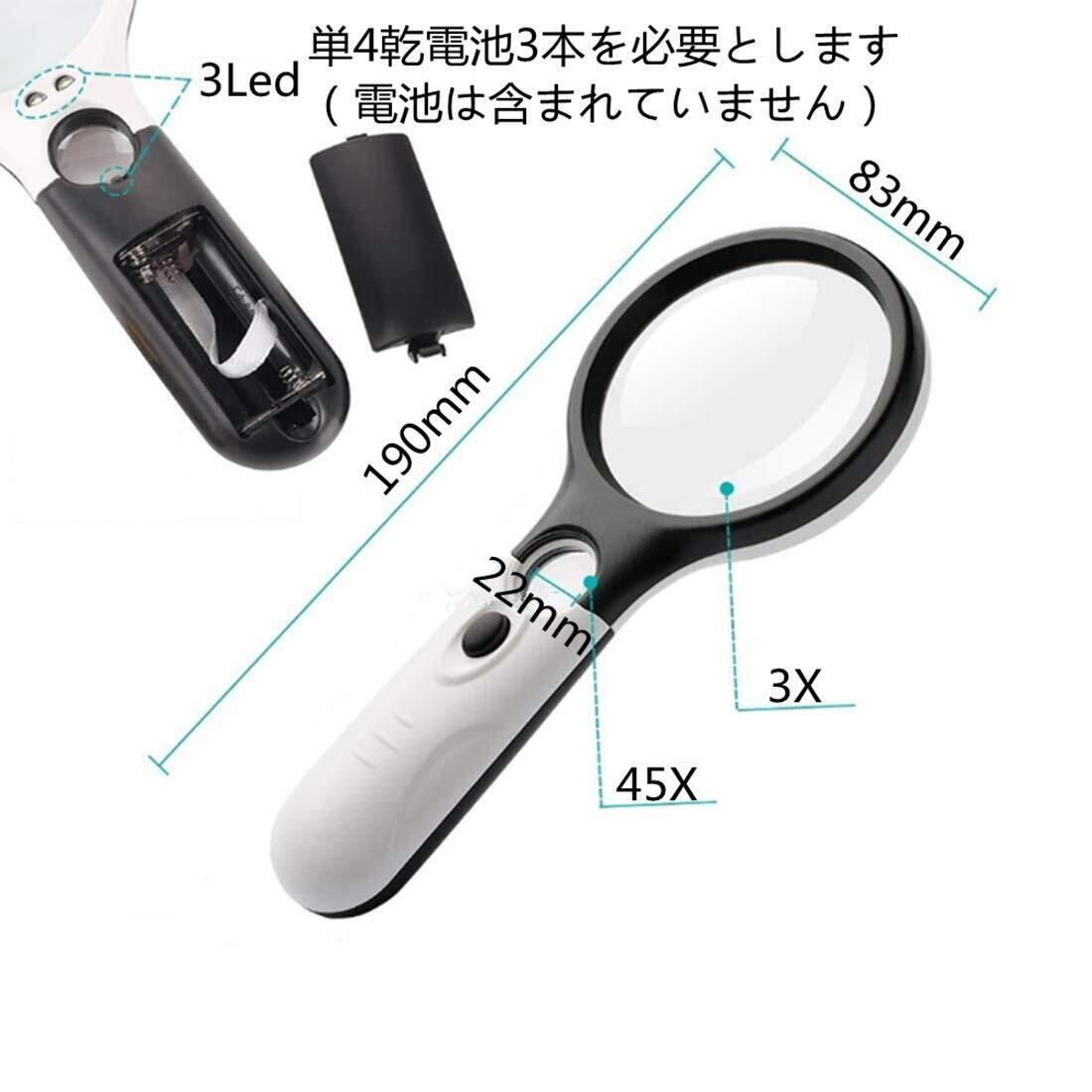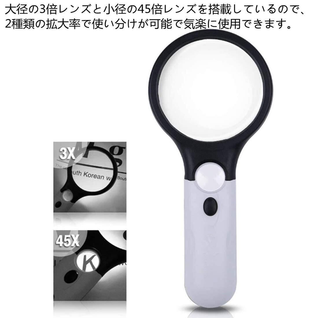 手持ちルーペ 3個LEDライト付き 虫眼鏡 拡大鏡 【3倍&45倍】2種類レンズ 直径75mm 携帯便利 読書 新聞 鑑定用 照明用 子ども、高齢者及び専門家使用可能 アクリル ブラック