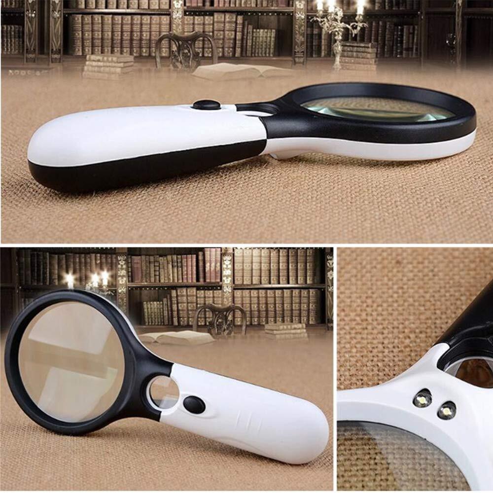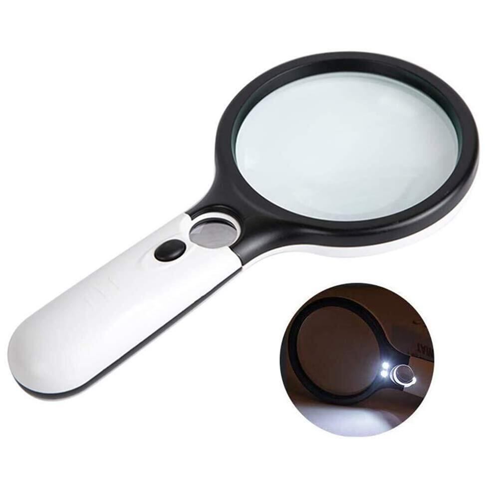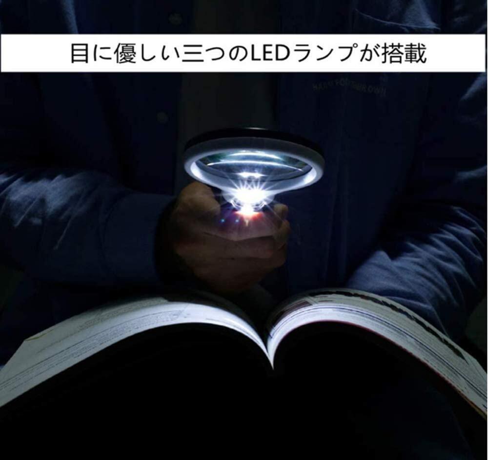 手持ちルーペ 3個LEDライト付き 虫眼鏡 拡大鏡 【3倍&45倍】2種類レンズ 直径75mm 携帯便利 読書 新聞 鑑定用 照明用 子ども、高齢者及び専門家使用可能 アクリル ブラック