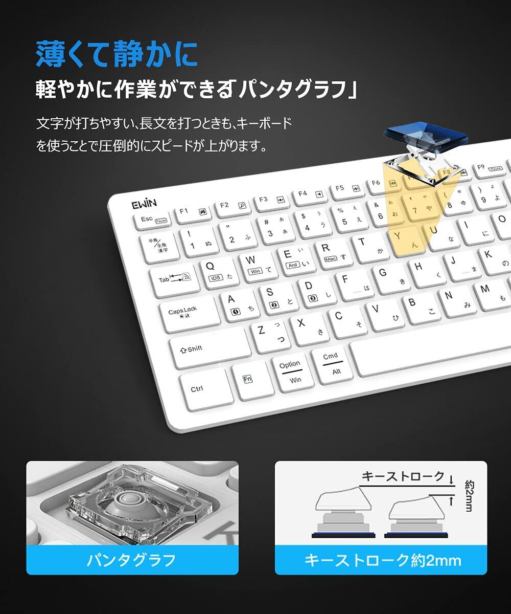 【薄型軽量ながら高い耐久性を実現】 サイズは29cm×12.5cm×1.8cm、重さ約290g、外枠がスリムな薄形コンパクト設計で持ち運びに最適です! さらに、300万回を超えるタイピングテストを行い、耐久性を実証します。薄型軽量ながら耐久性にも優れた薄型無線キーボードを実現します。 キータイプには、ノートパソコンのキーボードと同じ、軽い力で打鍵できる「パンタグラフ方式」を採用しています。