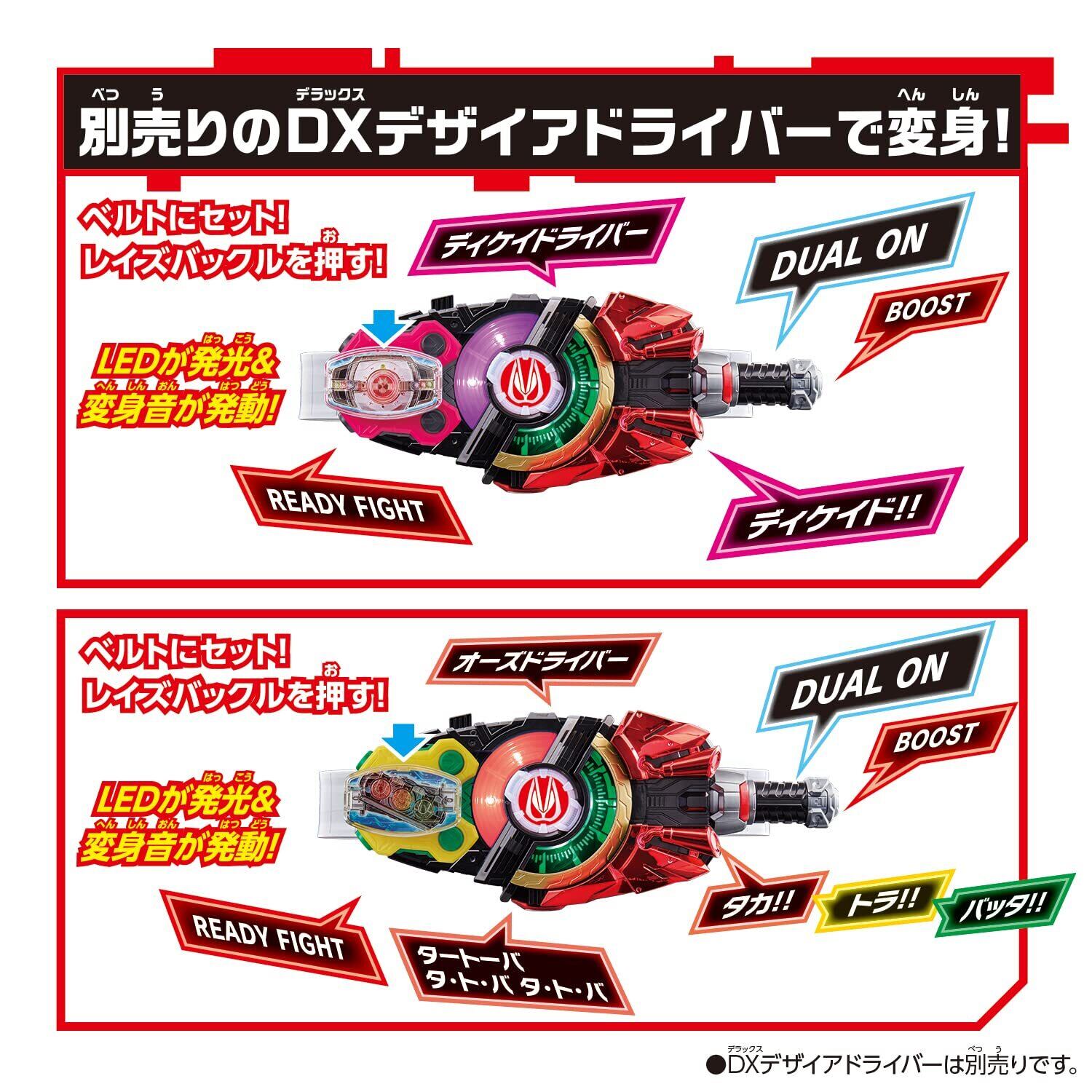 別売りの「変身ベルト DXデザイアドライバー」にセットして押すと、仮面ライダーディケイド、仮面ライダーオーズそれぞれの変身音が流れ、DXデザイアドライバーの変身なりきり遊びが広がります。