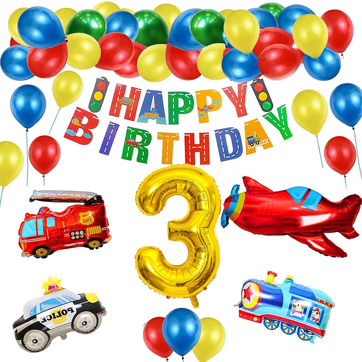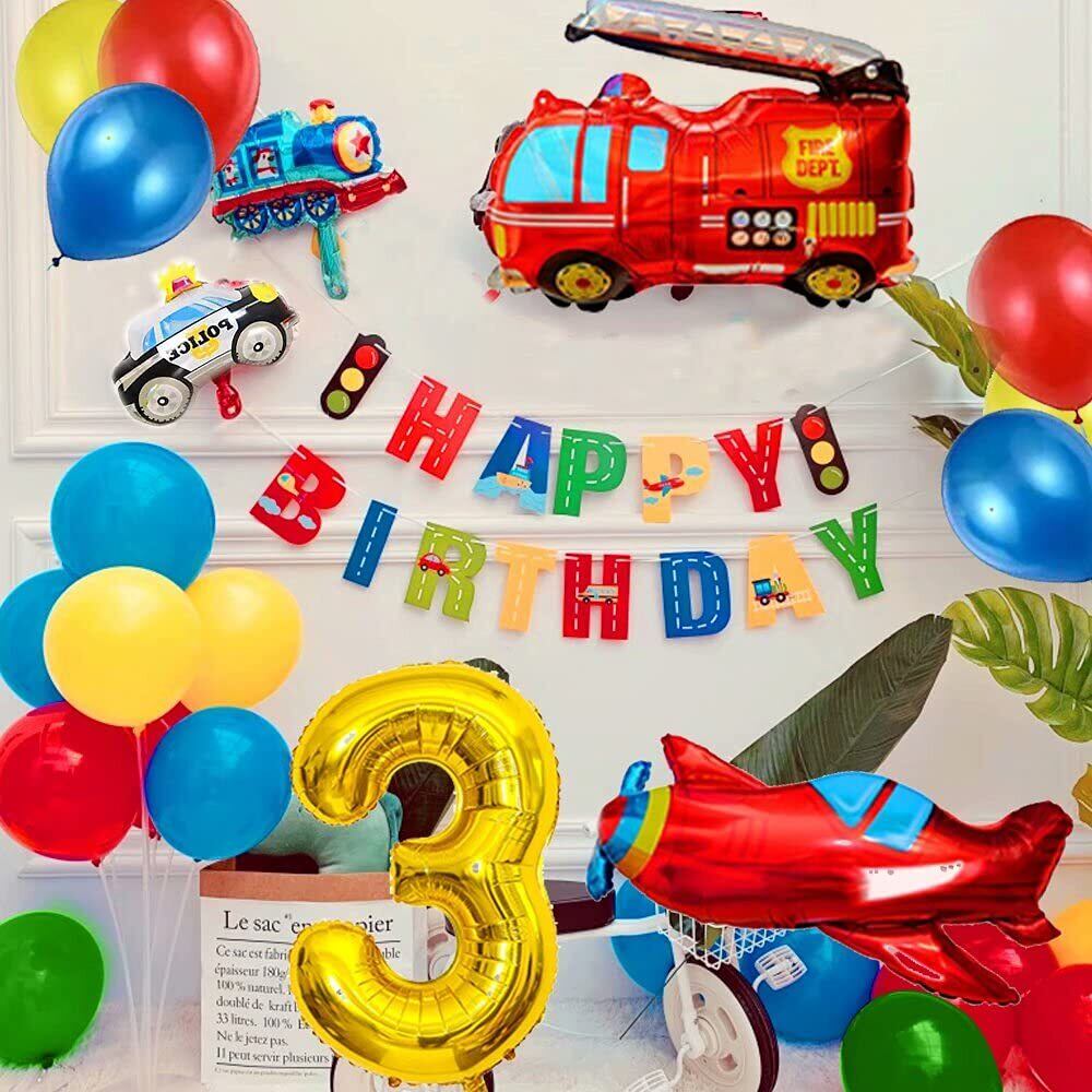 「誕生日 バルーンセットの内容」①81cm数字バルーンx1 ②25.4cmゴム風船x24(赤色、青色、黄色、緑色) ③アルミ風船x4(飛行機*1、列車*1、パトロールカー*1、消防車*1) ④「HAPPY BIRTHDAY」バナーx1 ⑤リボンx1 ⑥ドットグルーx1 男の子が大好きな車テーマ誕生日 飾り付け セット、素敵なバースデー 飾り!