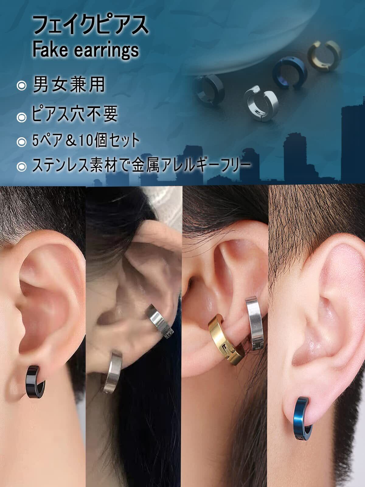 【ピアス穴がいらないフェイクピアス 】ピアス穴を開ける必要のない耳に挟むフープピアスタイプのイヤーカフ・ノンホールピアスです。耳に挟んでとめるだけで簡単に装着でき、普通のピアスと変わらない見た目で周りから疑われることなくフェイクピアスを存分に楽しんで頂けます。ピアス穴開けるのを躊躇している方、平日職場や学校の関係で、イヤリングが禁止されている職場人、ジュニア、学生にぴったりピアスセットです。