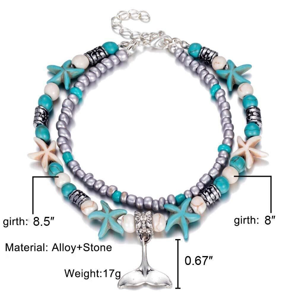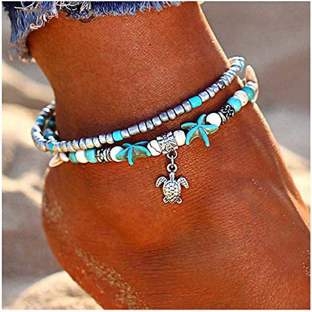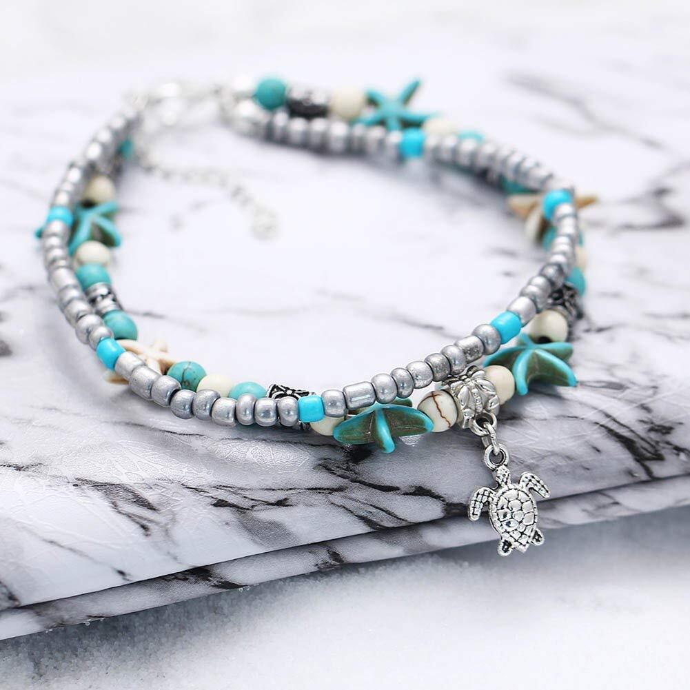 Lucbuyボヘミアン足首、足首のブレスレット、青と白の多層グラマービーチ砂手作りアンクレット足女性らしい女の子の贈り物、デート/パーティー/卒業/ショッピング/ビーチに適して (ウミガメ)