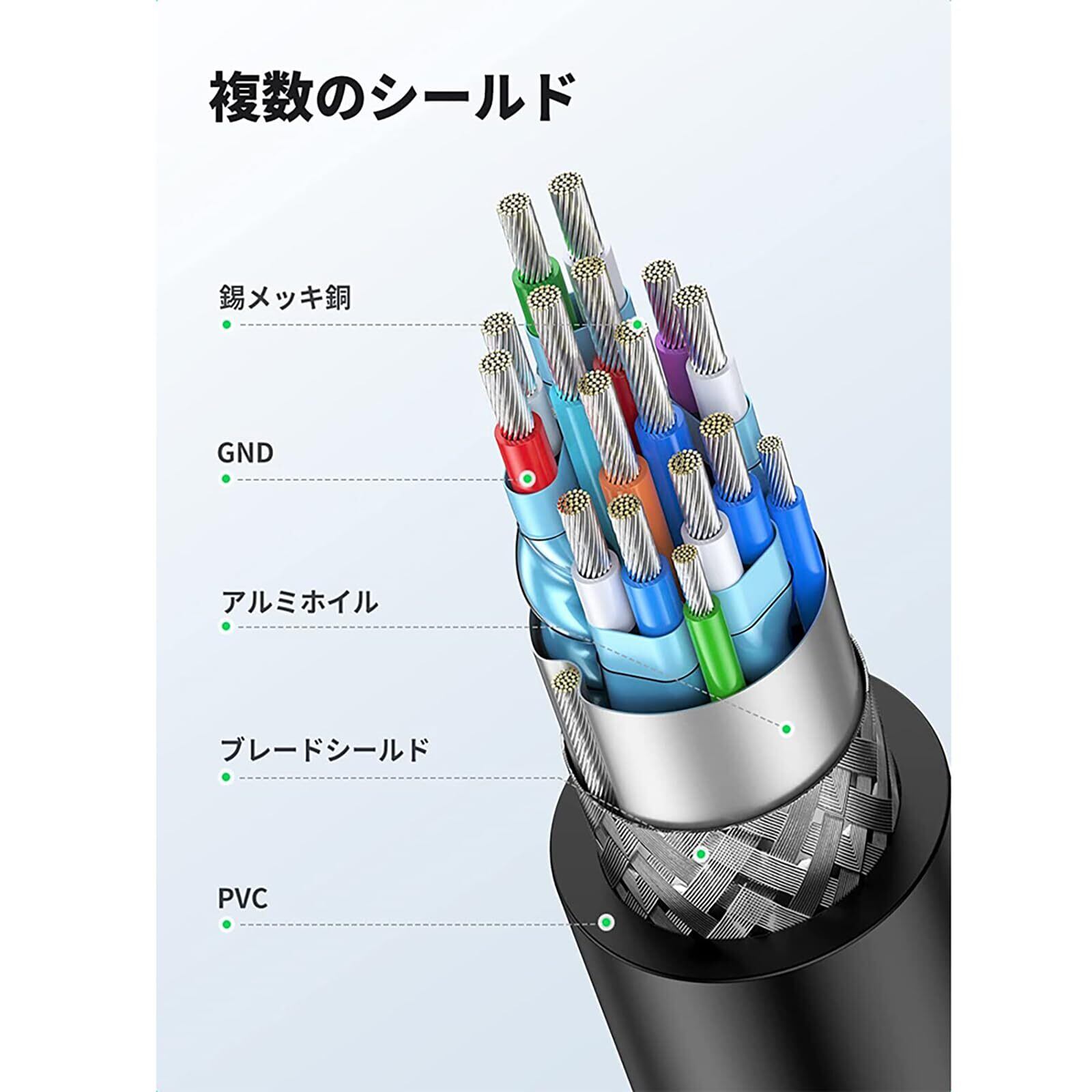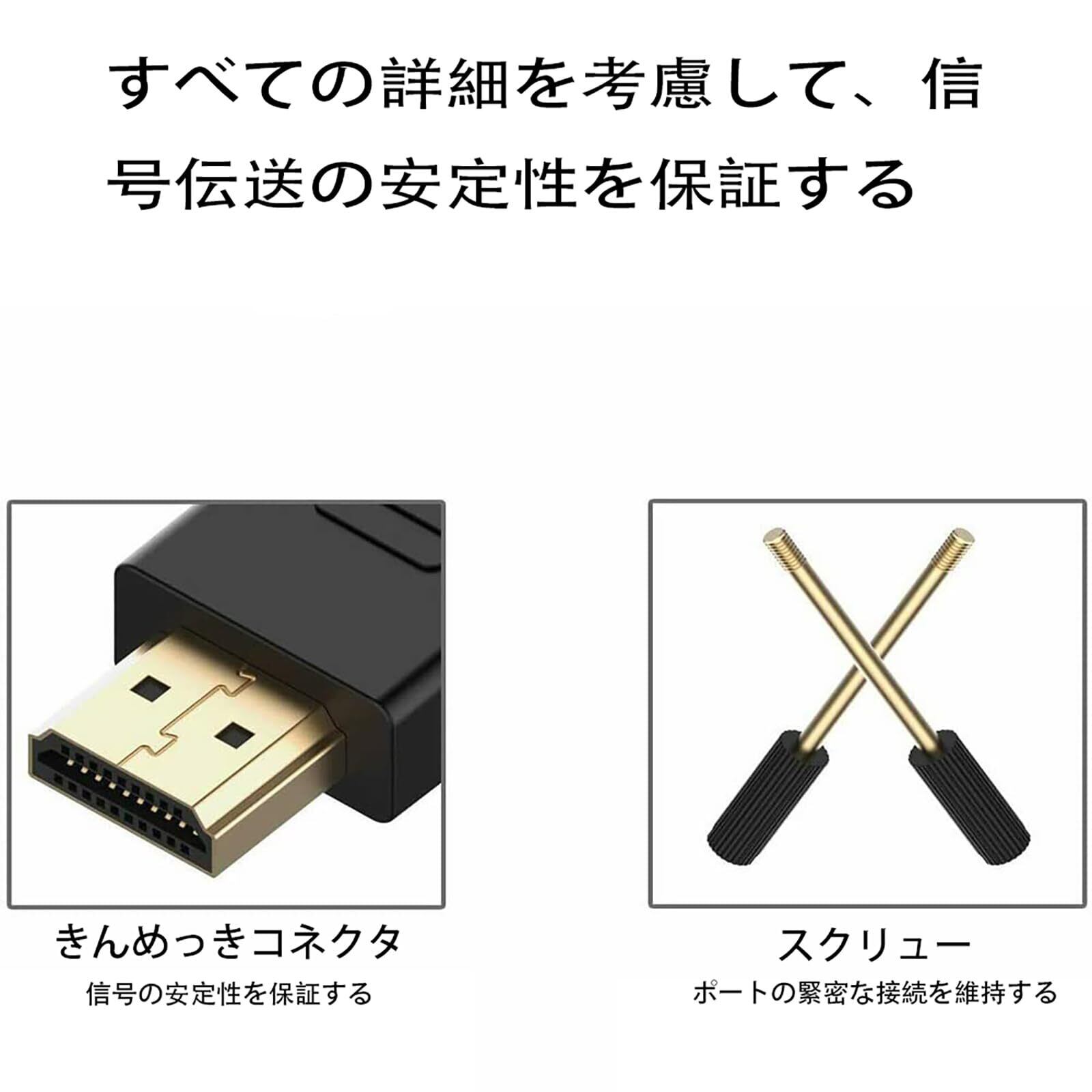 【安定した信号伝送】24K金メッキコネクタは、接触抵抗が少なく、サビなどによる画質・音質の劣化を防ぎます。10,000回以上の挿抜テスト済です。また、多重シールド構造により、クロストークとノイズを最小限に抑え、電磁干渉(EMI)と無線周波数(RFI)干渉から守ります。