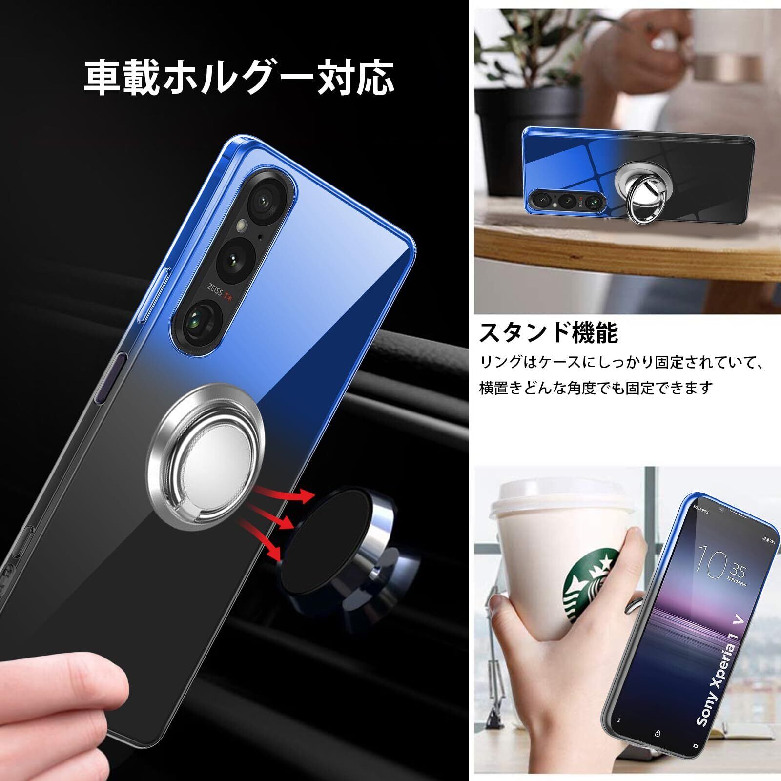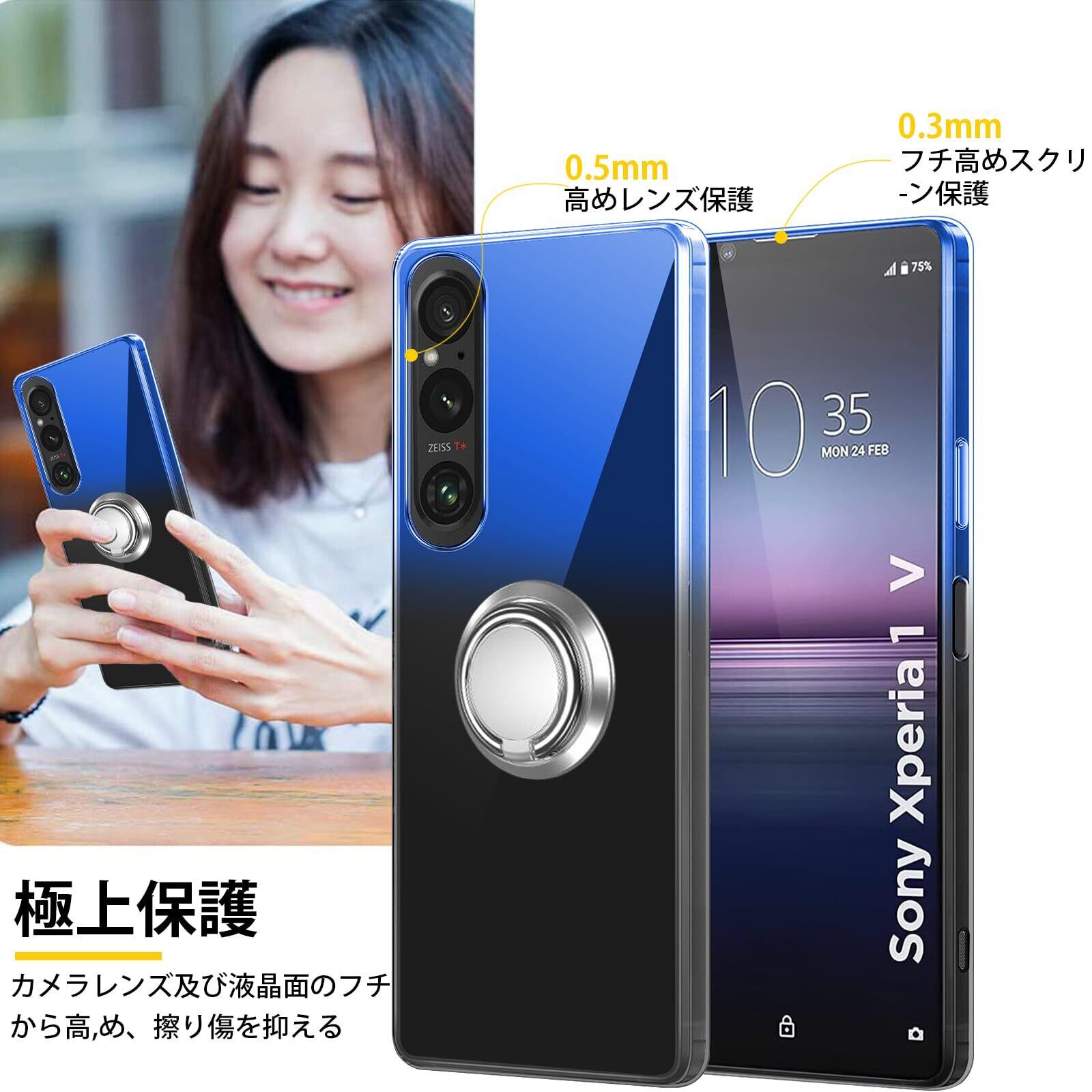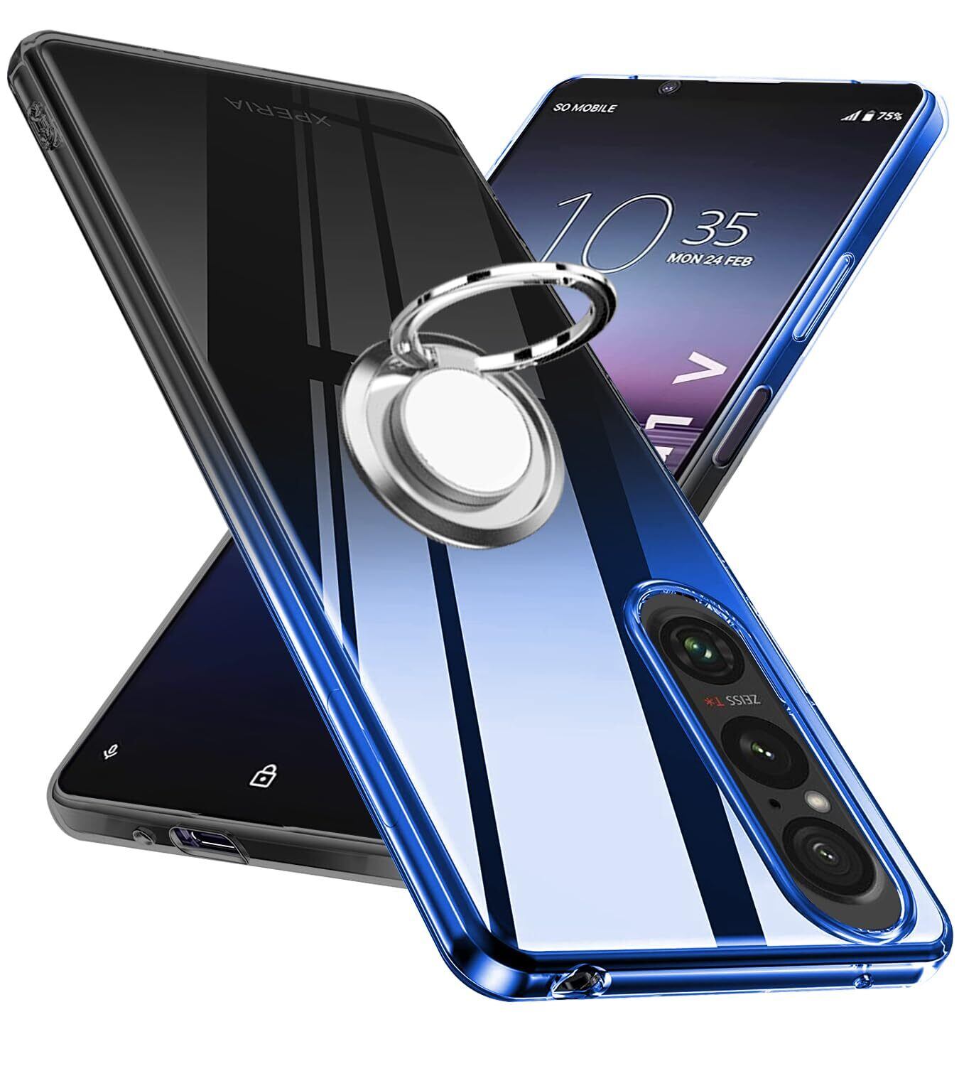 Xperia 1V ケースリング付き クリア TPU 薄型 軽量 Xperia1 V SO-51D スマホケース シリコン グラデーション色 ケース 耐衝撃 指紋防止 車載ホルダー対応 防塵 一体型 人気 携帯カバー ストラップホール付き (ブルーブラック)
