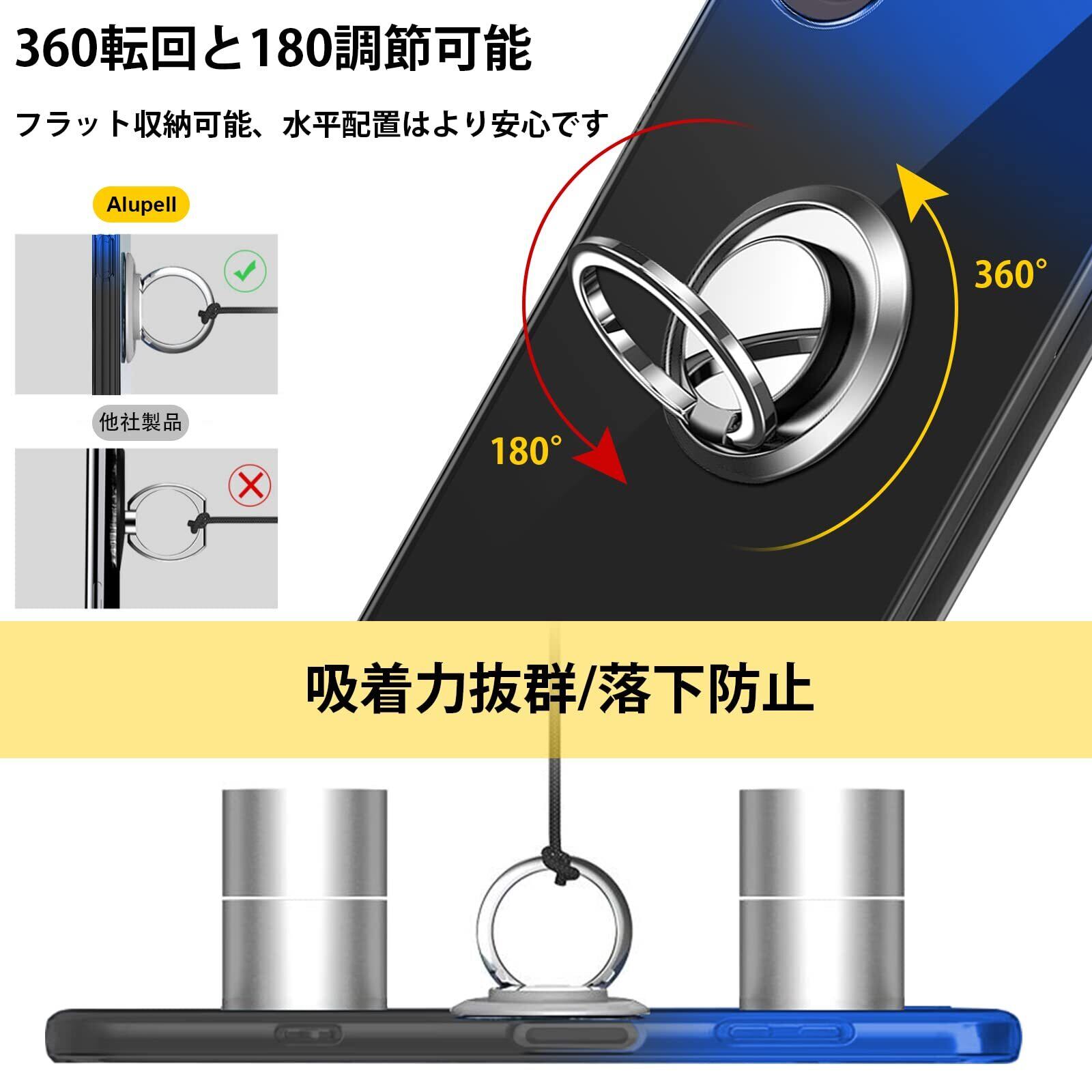 【360°回転】ブラケットは360°回転できます、垂直画面で小説を読むことができます、または、画面全体でビデオを見る。一指着る式で、指がリングに通り抜け、片手で携帯を操作でき、落下防止します。