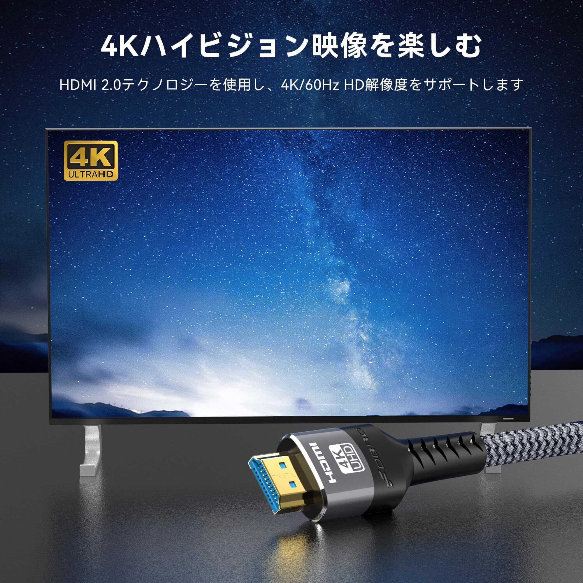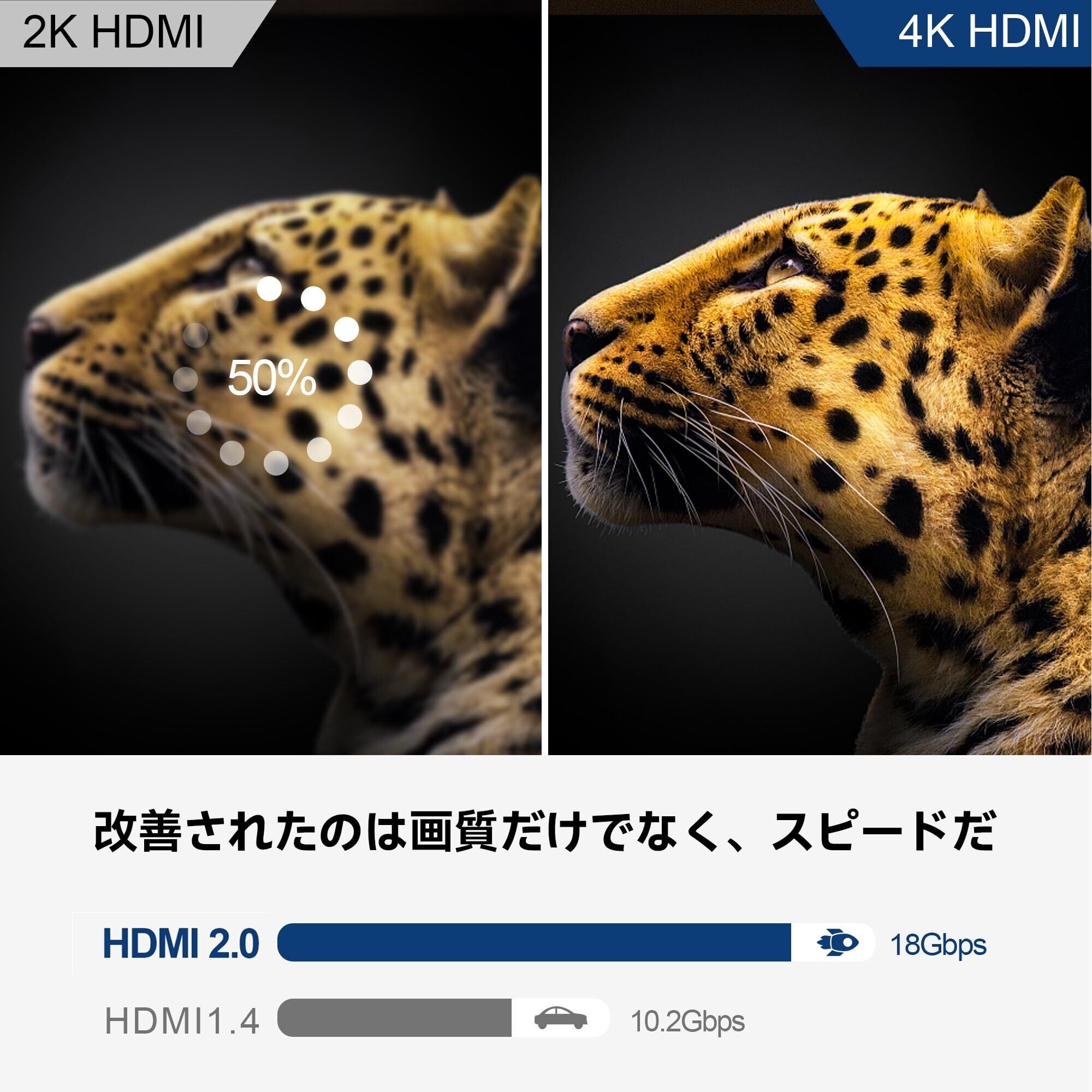 HDMI 2.0対応—HDMI 2.0インターフェースを持つ機器で使用できるケーブルで、最大4K@60Hzの解像度とリフレッシュレートに対応しています。また、HDR、3D、ARCにも対応しており、画像と音声を同時に忠実に表現することができます。