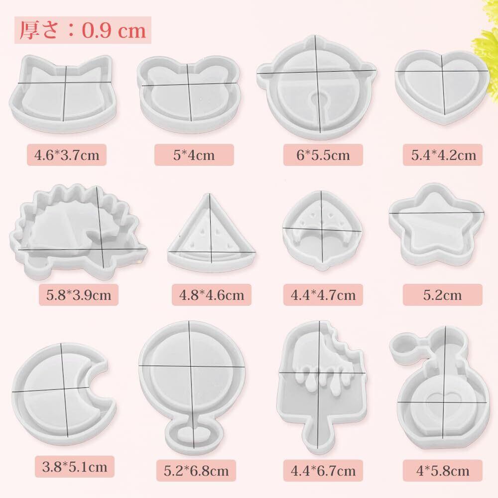 【種類が多い】流れ砂型のモールド合計12種類。可愛いシェイカーモールドセットです。猫、星、ハート、月、惑星、スイカ、アイス、クマ、ハリネズミ、懐中時計...さまざまな形状とサイズがあるので色々とお楽しみいただけます。
