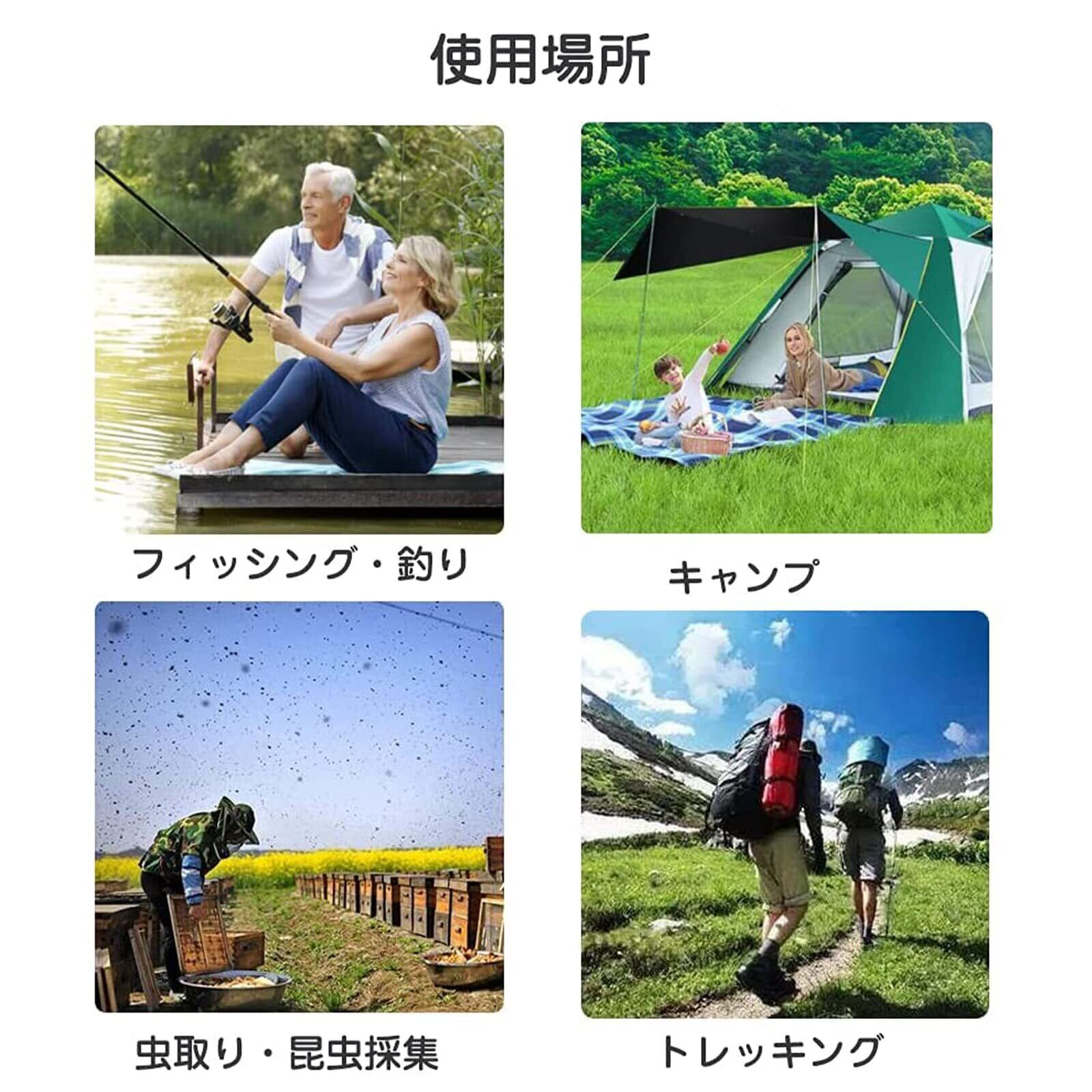 【使用広さ】アウトドア、登山、トレッキング、ハイキング、山仕事、虫取り・昆虫採集、カメラマンの撮影、バードウオッチング、釣り、野外イベント、蚊よけ・防虫、虫対策 、口、耳、目などに入り込む不快なハエ対策などでご使用頂けます。