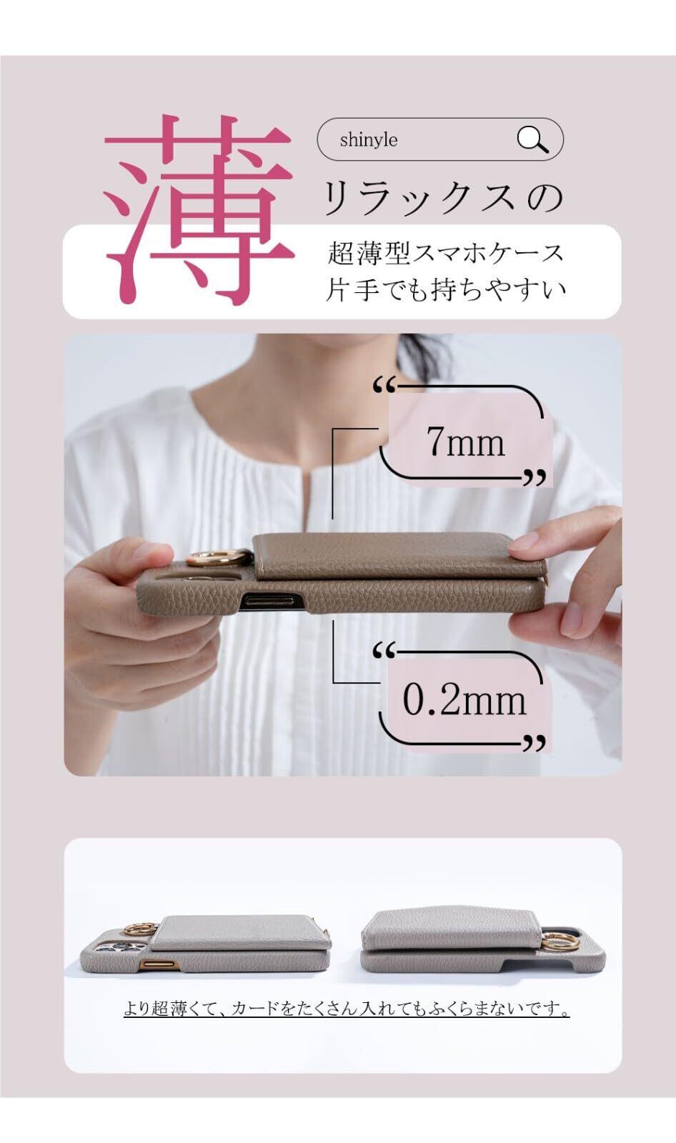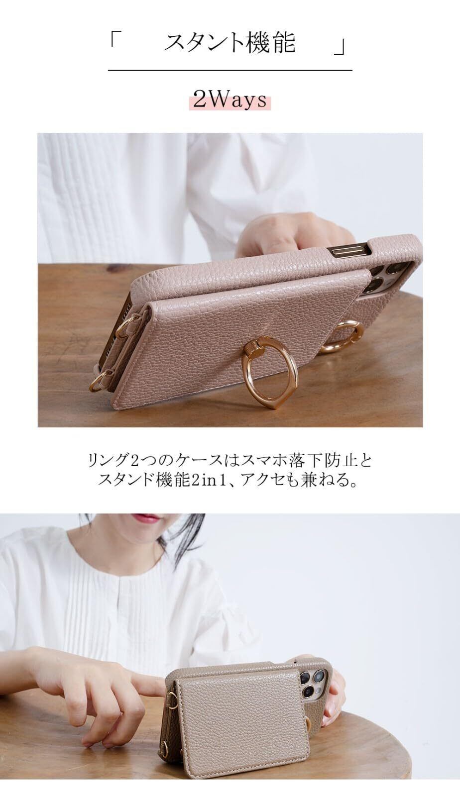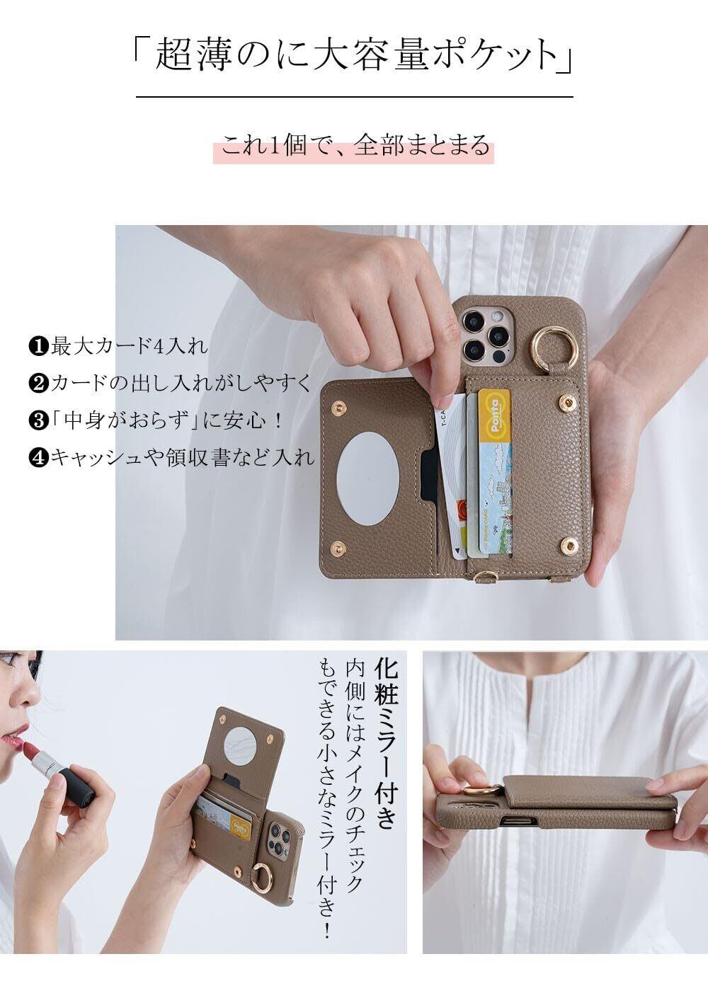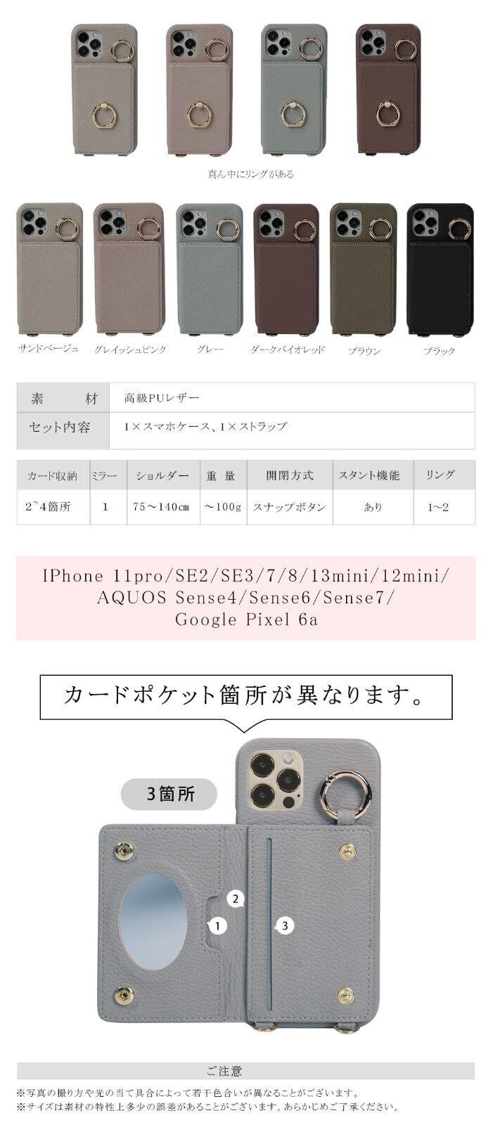 【商品特徴】■ショルダーストラップ付き ■マグネットなし ■カード収納4箇所があり ■ミラー付き ■スピーカー/充電ホール付き ■スタンド機能付き ■リング付き