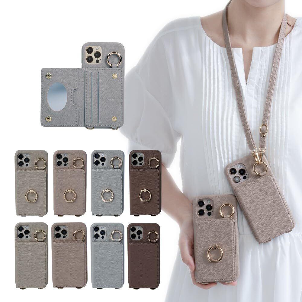 極薄 スマホケース ショルダー タイプ iphone13 pro max スマホ ショルダー 携帯ケース ストラップ付き 背面カード収納 リング付き マグネットなし背面手帳型 ケース レザー ショルダー ミラー付き