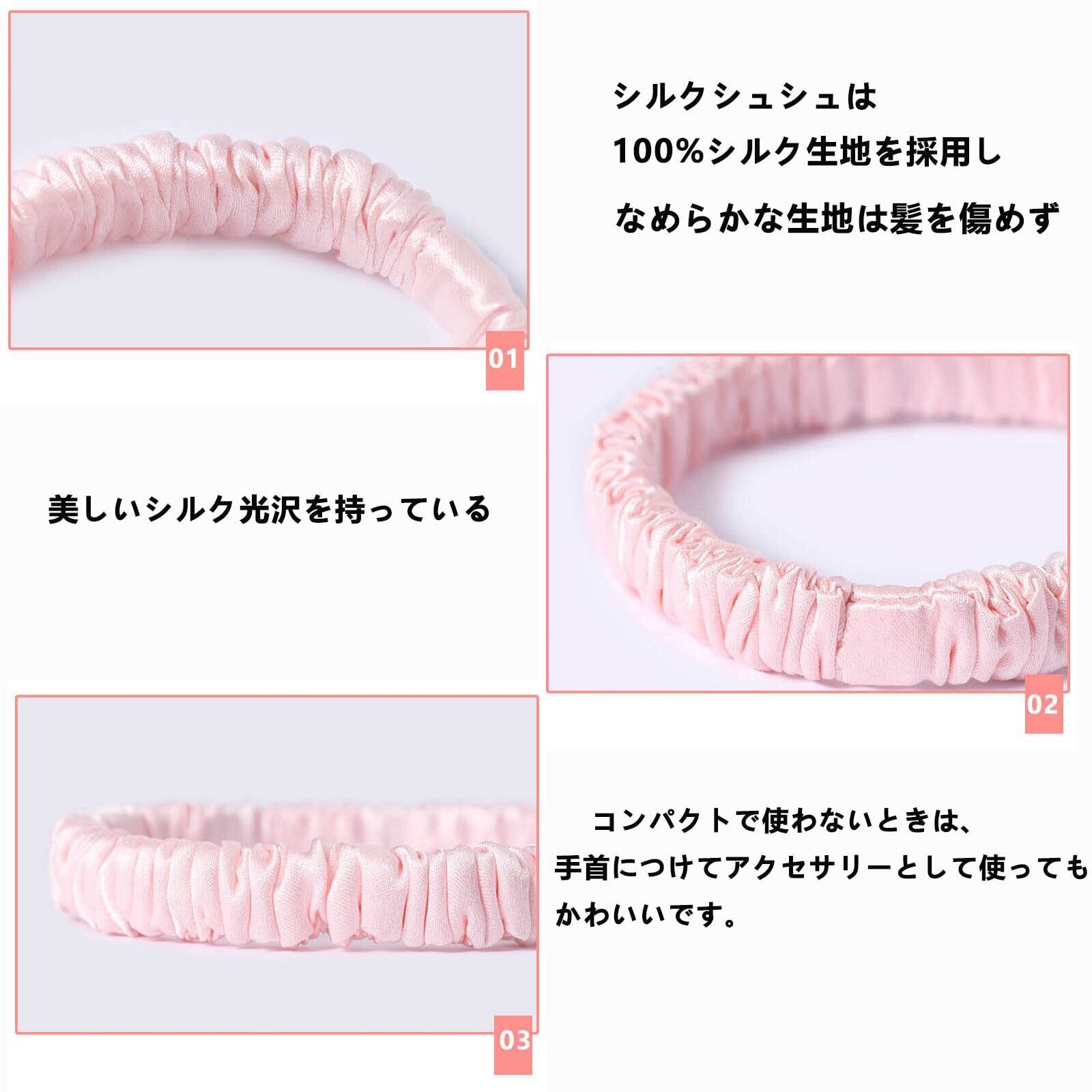 【100%シルク】:シルクシュシュはシルク生地を採用し、弾力が高く、しなやかで繊細で、美しいシルク光沢を持っています。なめらかな生地は髪を傷めず、ほどいた時に髪が絡まらないので痛みはありません。