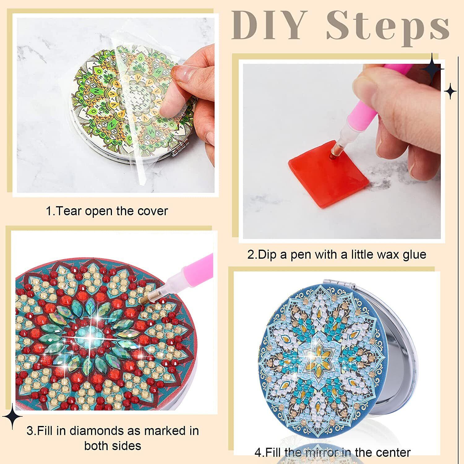 【ダイヤモンドアートセット包装内容】ダイヤモンドアート両面鏡*1個、カラフルなダイヤモンド(ダイヤモンドビーズの不足を避けるため、ビーズの数を35%増やした)、ビーズトレイ*1個、ダイヤモンドペン*1本、粘土グルー*1個。
