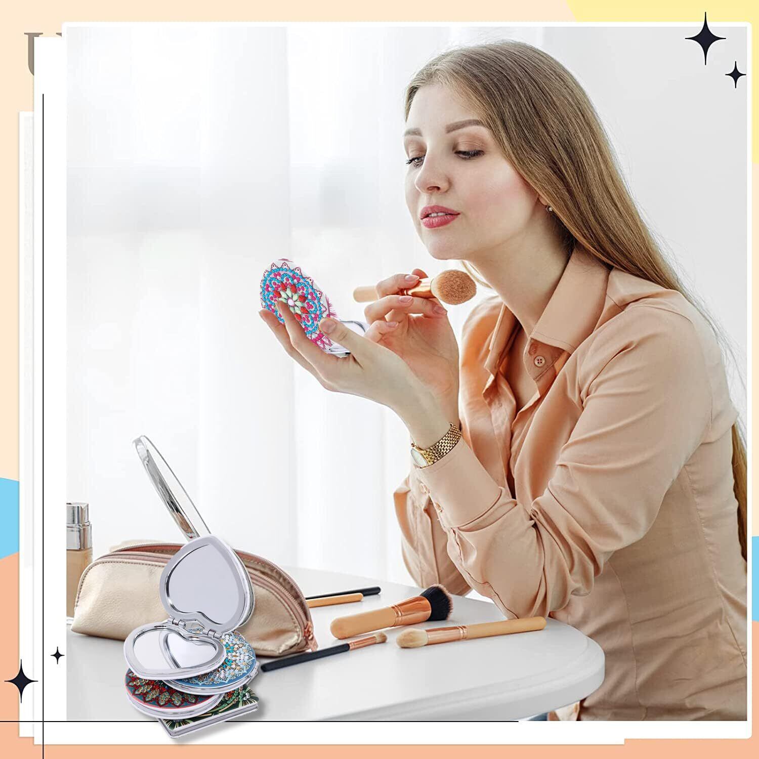 【両面鏡設計+高品質材質】ダイヤモンドアート手鏡はPU+高品質金属+高品質ガラスで作られている。手鏡は両面デザインで、ダイヤモンドも両面全面貼り付けです。鏡の片面には拡大鏡機能があり、メイクをより細かく見ることができ、肌の状態をチェックしたり、口紅を塗ったり、マスカラを塗ったり、イヤリングやネックレスをつけたりするのに役立ちます。ダイヤモンドの化粧鏡はコンパクトで使いやすく、日常生活のさまざまな場面に適しており、デート、パーティー、会議、講演、講座などのイベントに参加する前にあなたのメイクをチェックすることも、より良いイメージを表現するのに役立ちます。