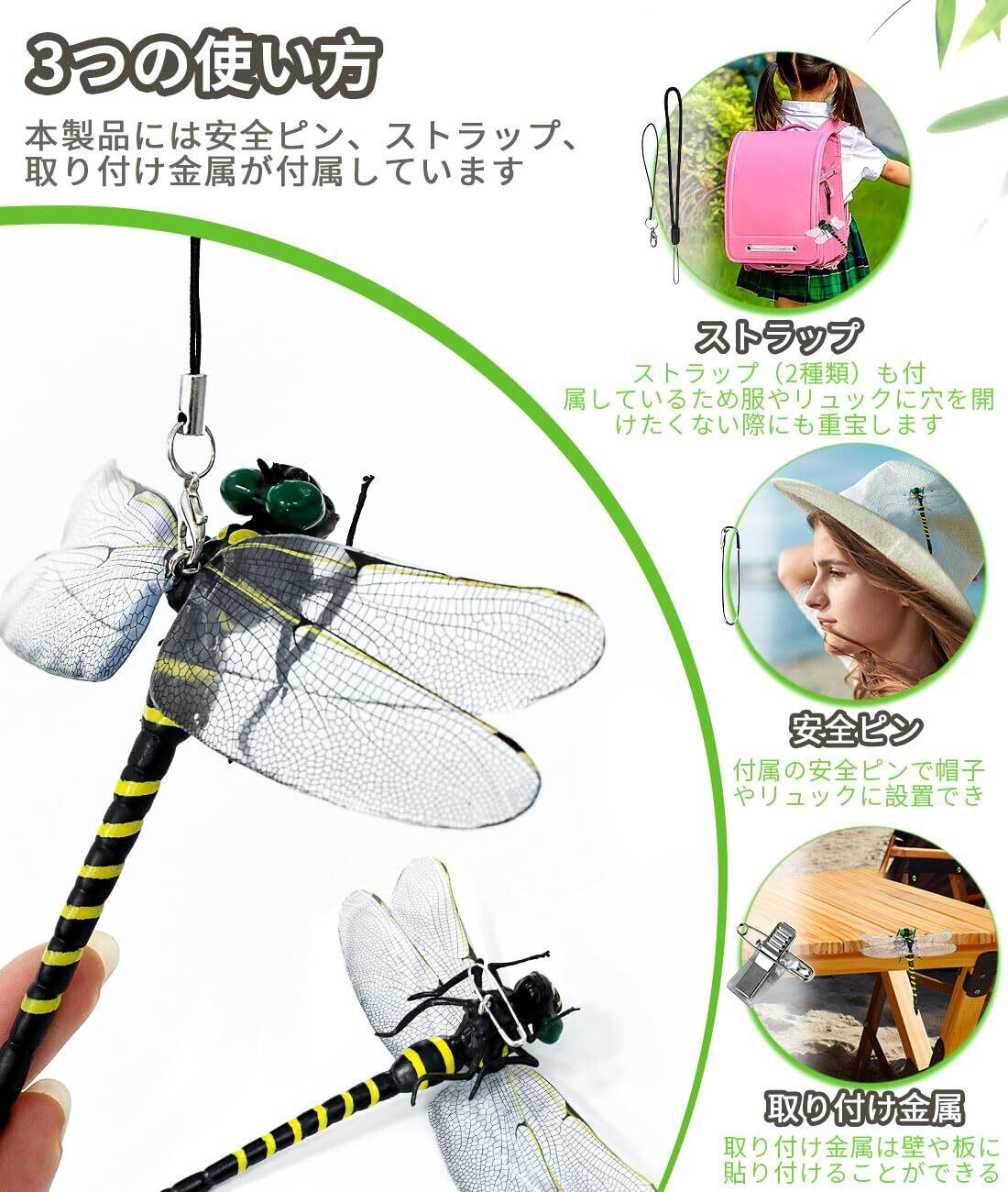 【3つの使い方】本トンボモデルには安全ピン、ストラップ、取り付け金属が付属しています。付属の安全ピンで帽子やリュックに設置でき、アクセサリー感覚で身に着ける事が出来ます。ピンだけでなくストラップ(2種類)も付属しているため服やリュックに穴を開けたくない際にも重宝します。また、取り付け金属は壁や板に貼り付けることができる