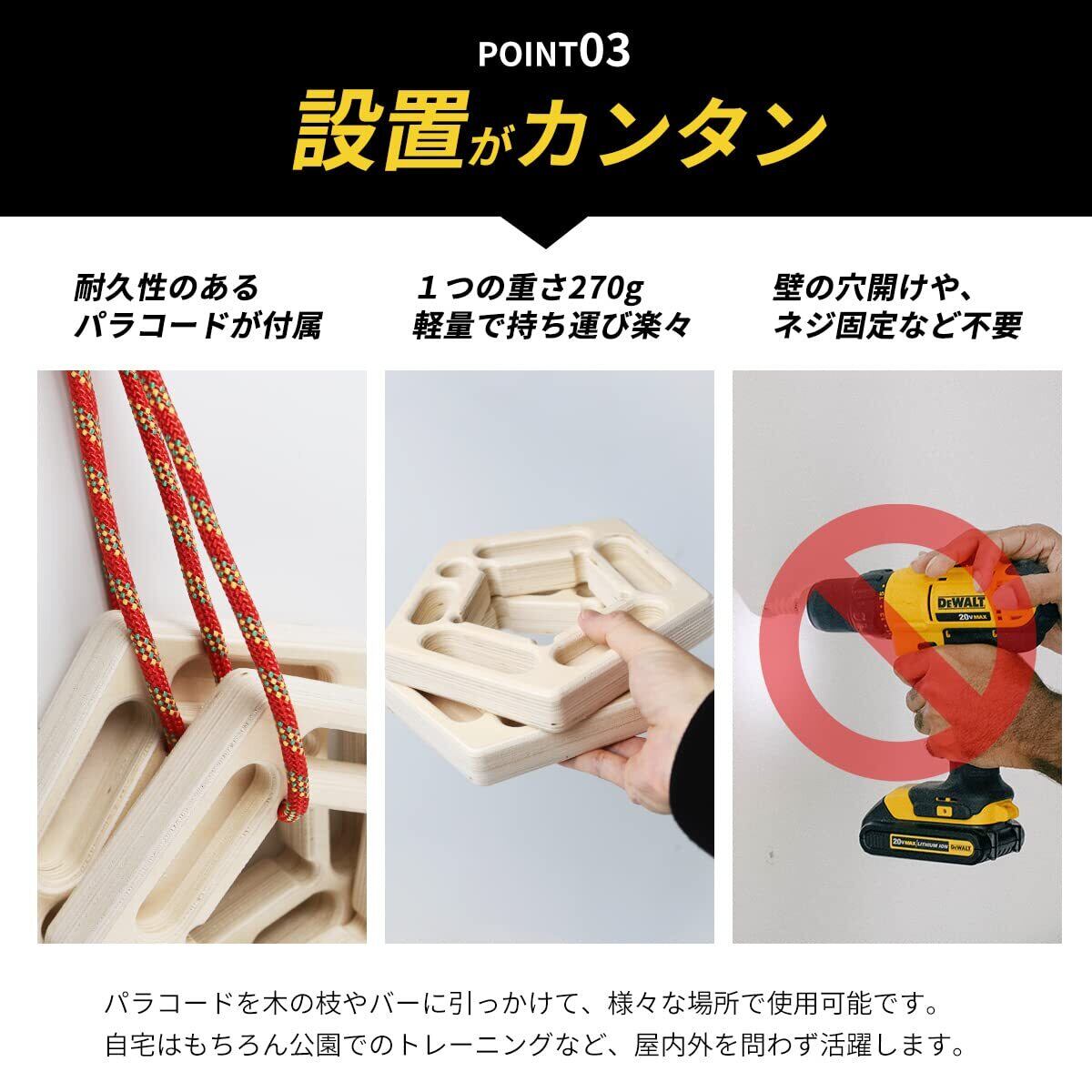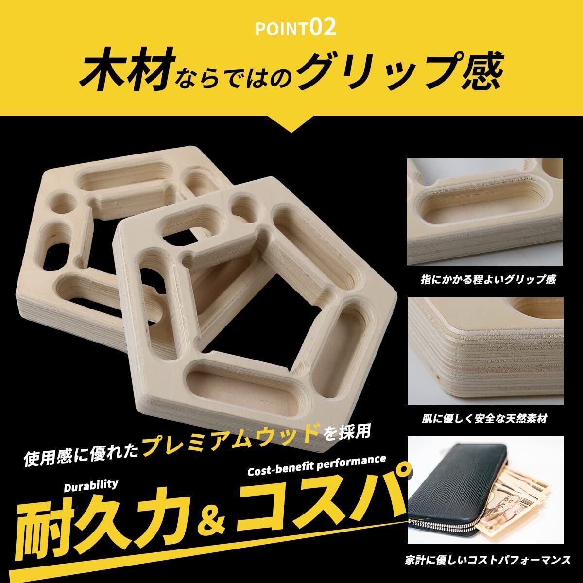 【カンタン取付&抜群の安定性】壁に設置するタイプのトレーニング器具が多い中で、もっと手軽に、壁を傷つけずに誰でも簡単にトレーニングができます。また、表面は耐久性の高いプレミアムウッドを滑らかに研磨。フィンガーポケットはカッティングの断面をそのままにすることで丁度良い摩擦を残すことで良好なグリップを確保しています。