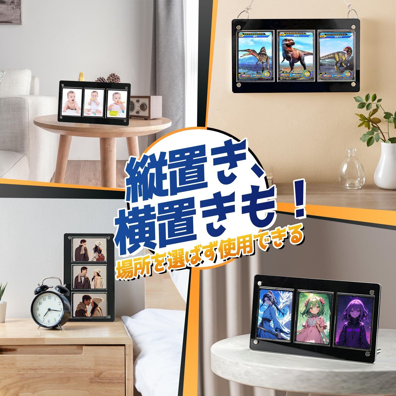 「3連スクリューダウン」標準サイズ:取り引きカードのためにデザインされています。標準サイズより少し小さいミニー型カードもセーブされます。「額縁サイズ:約24*14センチ」「カードフレームサイズ:約6.4*9センチ」黒いアクリル板1枚+透明アクリル板2枚(予備1枚)+専用ケース3枚+固定用ネジ+吊下具x2+ロープ約1M+クリーニングクロス