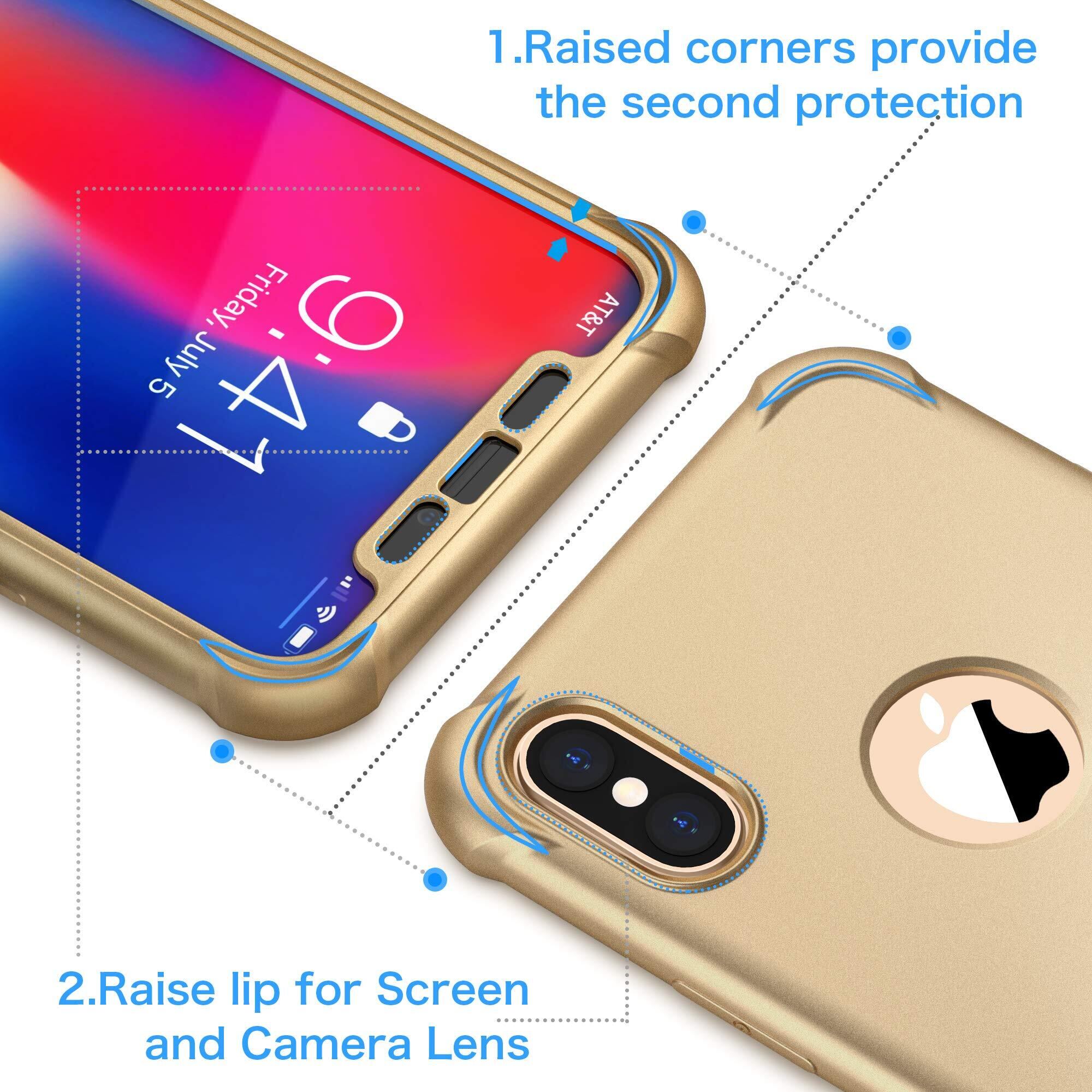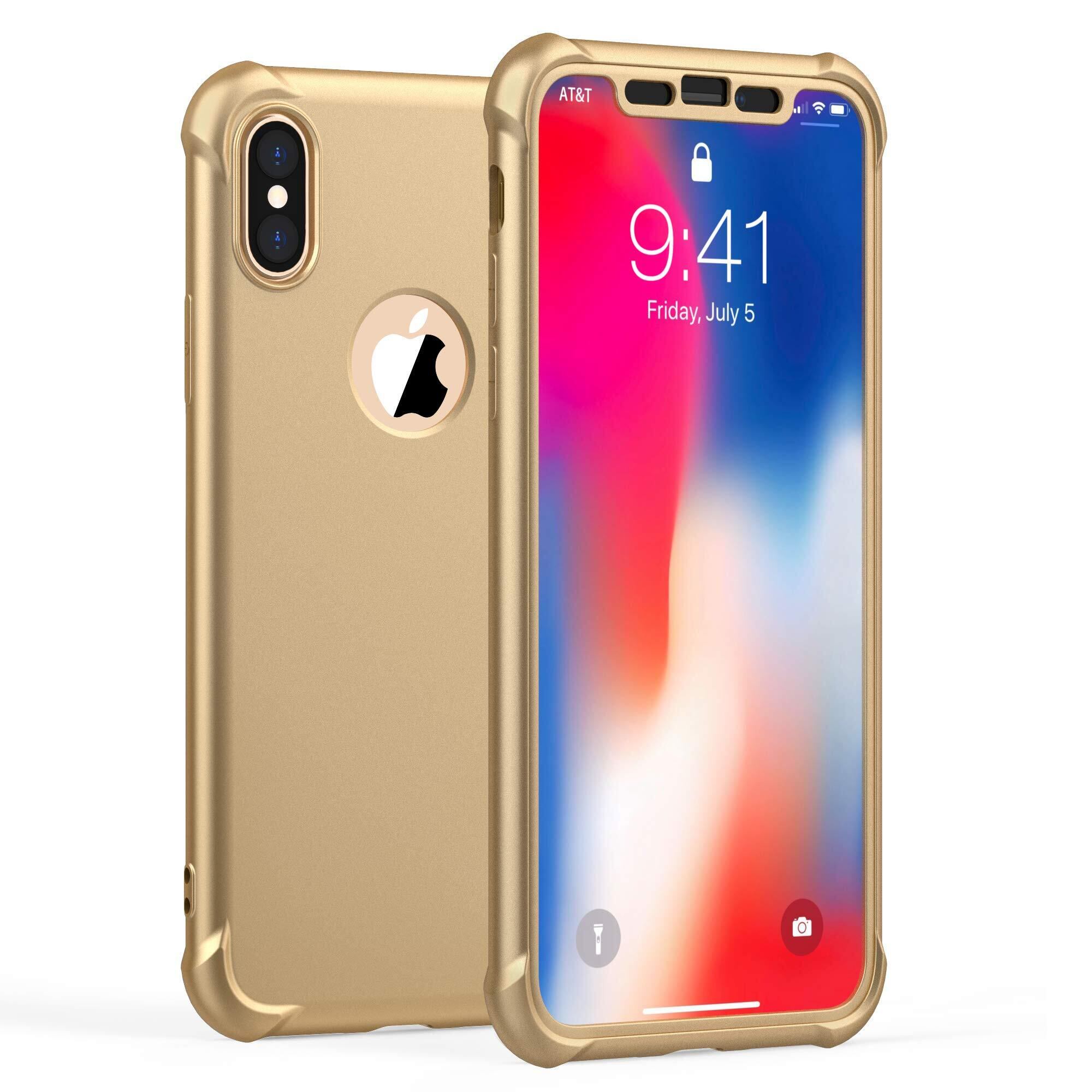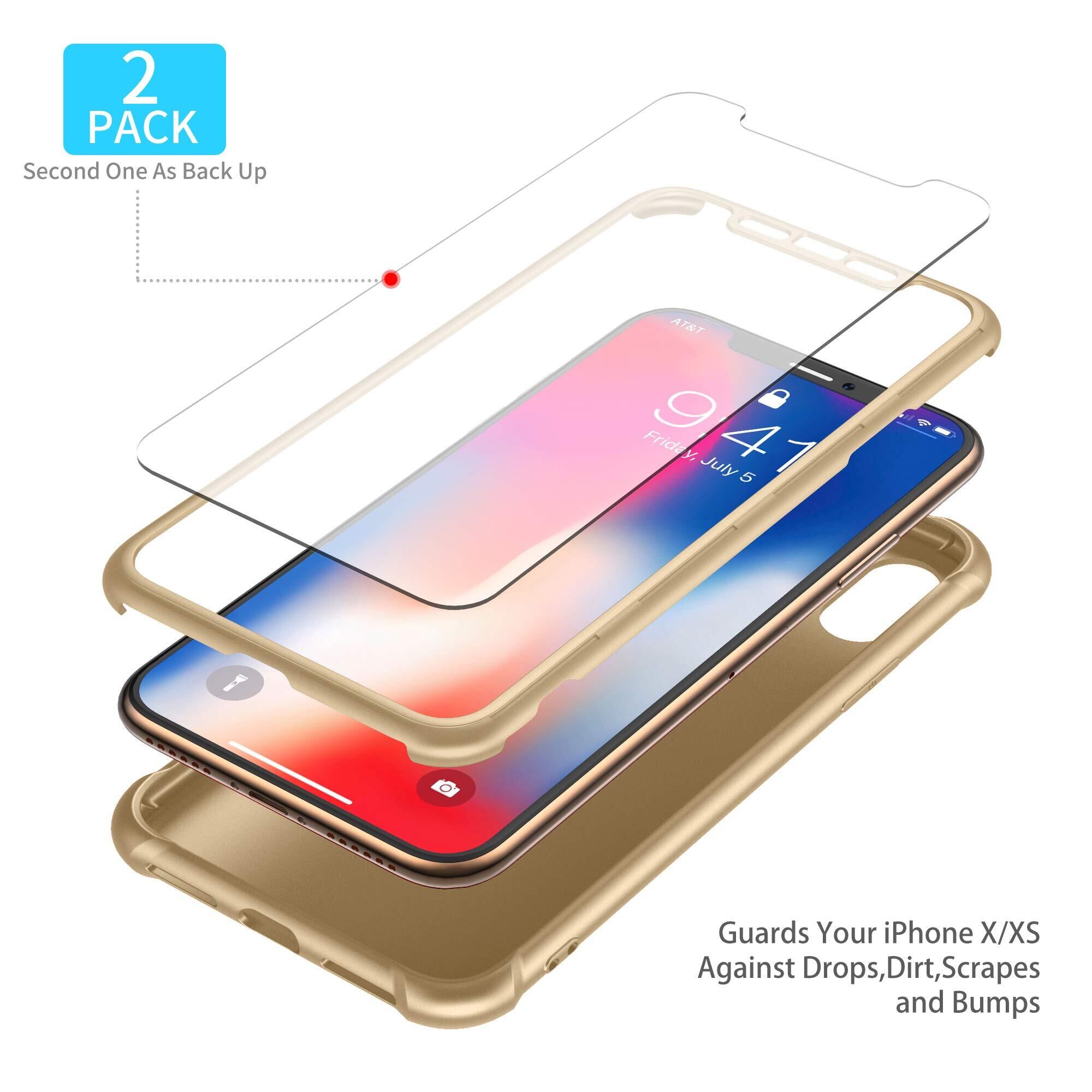 iPhone Xケースと互換性があります [2 x強化ガラススクリーンプロテクター]付きiPhone XSケース 360°全身耐衝撃ケース超薄型ハードPCシリコンケースカバーiPhone X/XS 5.8 ''(ゴールド)