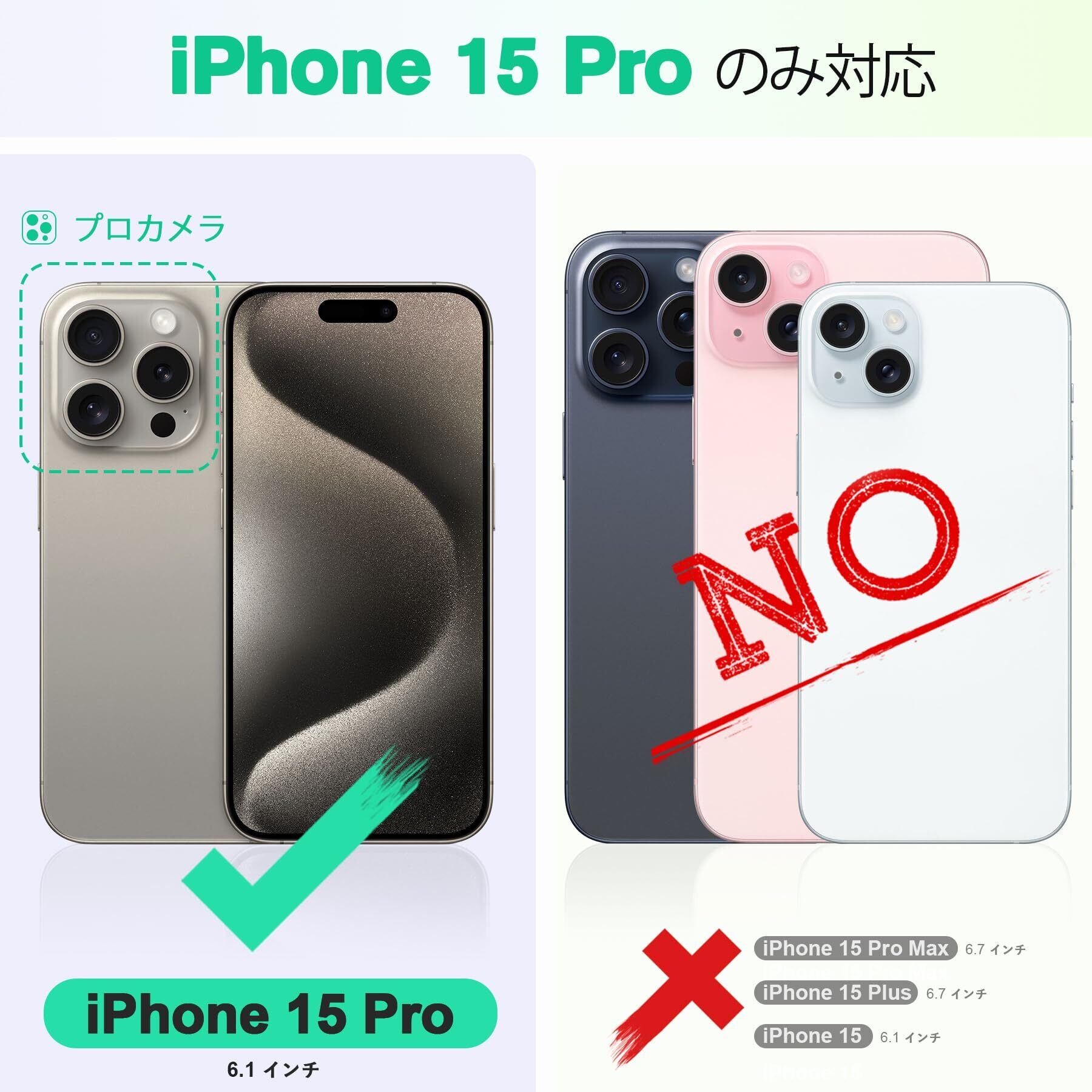 【対応機種】iPhone 15 Pro(2023年発売6.1インチ)のみ対応します。他の機種は対応しません。対応機種を十分ご確認の上、ご注文頂きますようお願い申し上げます。