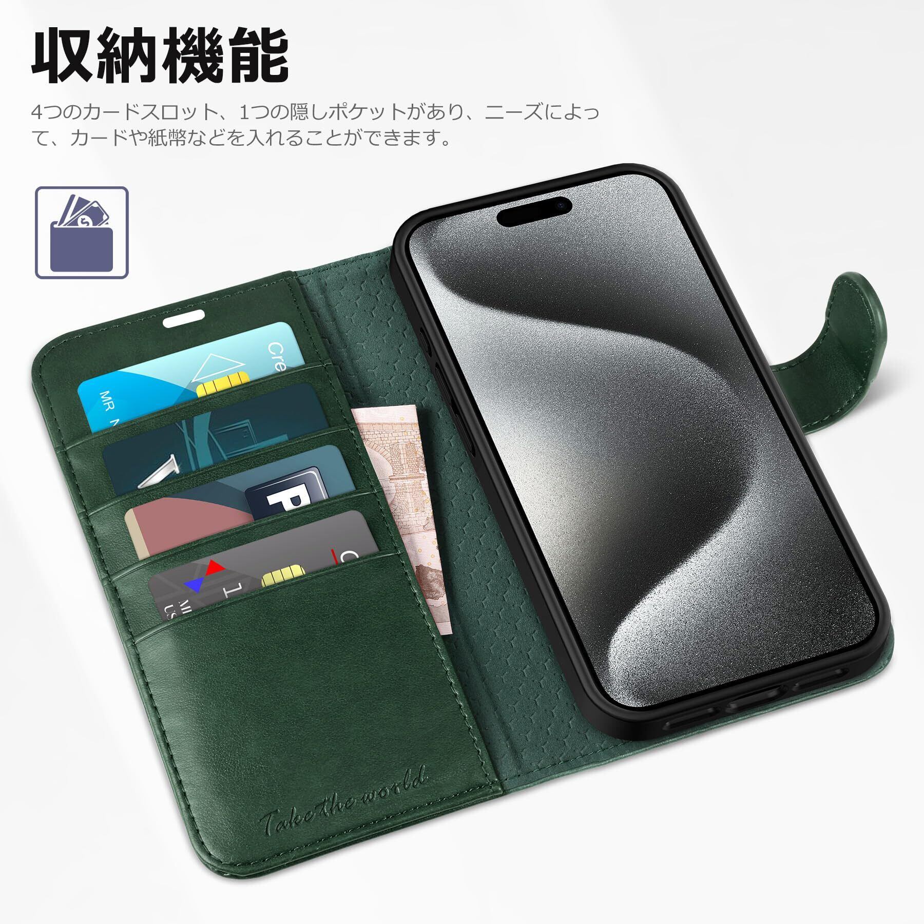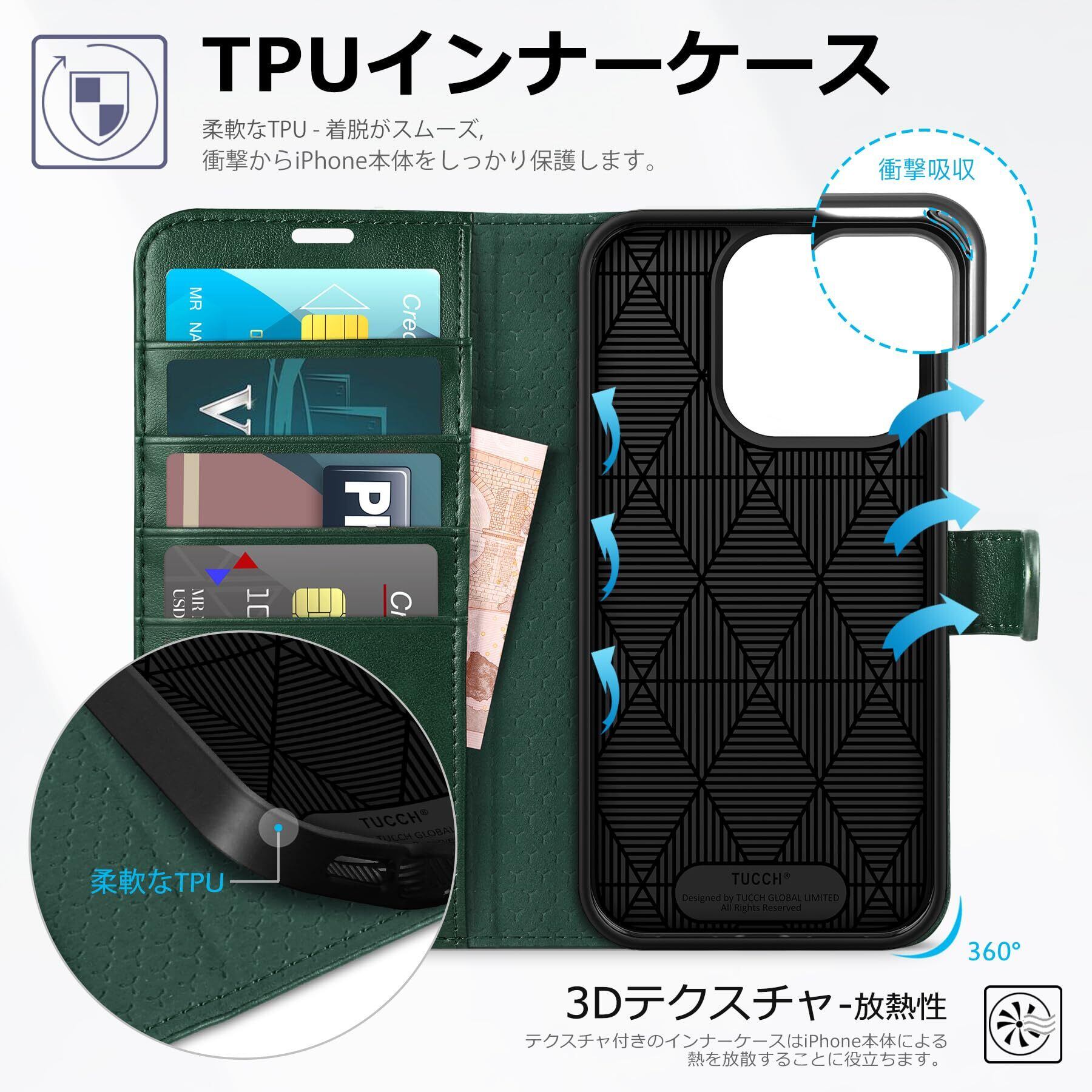 TUCCH iPhone15 Pro 対応 ケース 手帳型 iPhone15 プロ ケース手帳型 耐衝撃 高級PU合皮 TPU素材 カードポケット [RFIDブロッキング] 全面保護 横置きスタンド機能 マグネット アイフォン15プロ 手帳ケース (2023年発売 iPhone 15 プロ 5G 6.1 インチ対応) グリーン